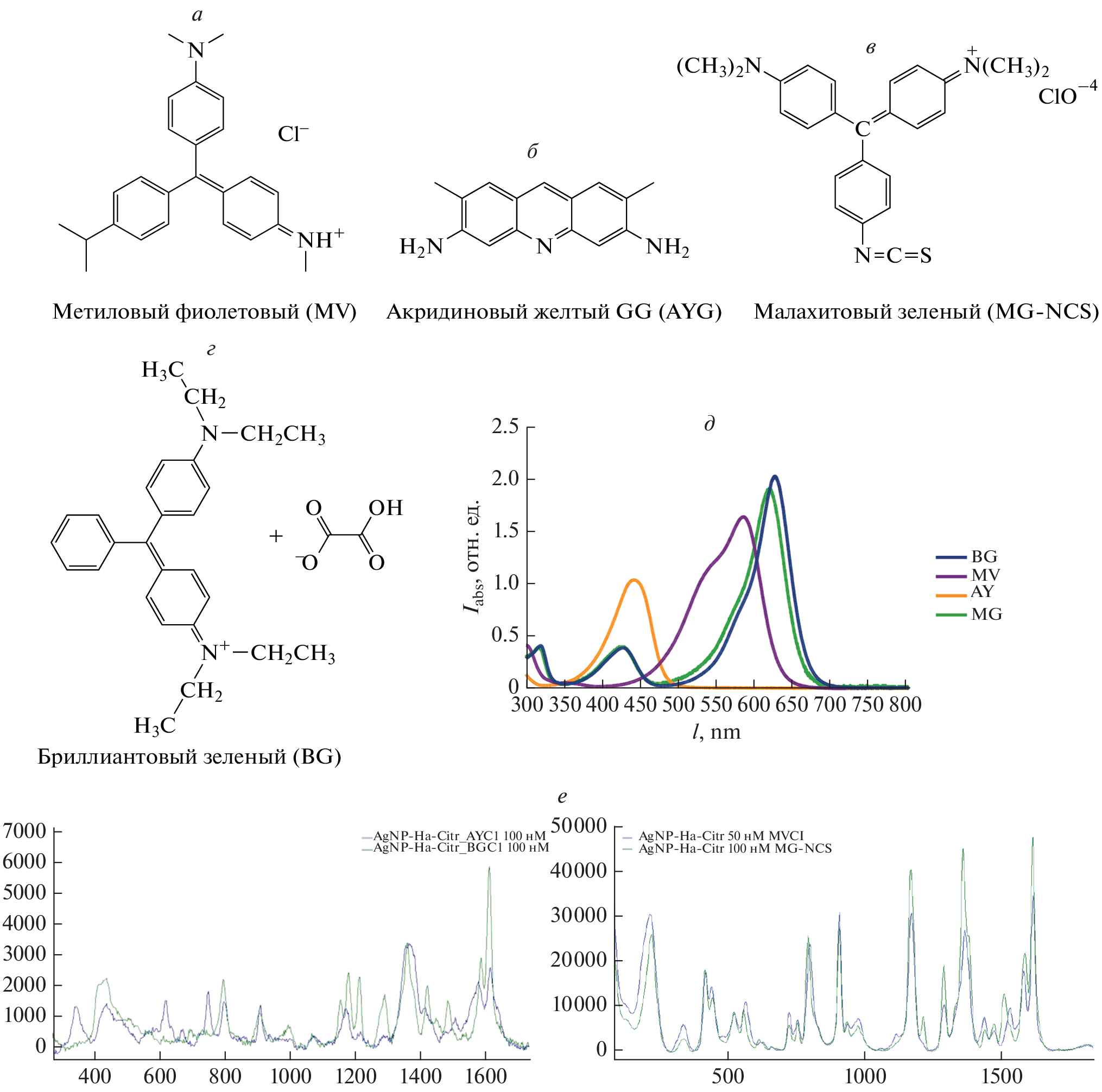 The adsorption (kinetics and signal stability) of cationic triarylmethane dyes and an acridine derivative with various counter-ions on citrate-stabilized hydroxylamine-reduced silver sols was studied using SERS spectroscopy. The influence of the method of nanoparticle synthesis, as well as the composition and ionic strength of the medium on the stability of nanoparticle–dye complexes was investigated.