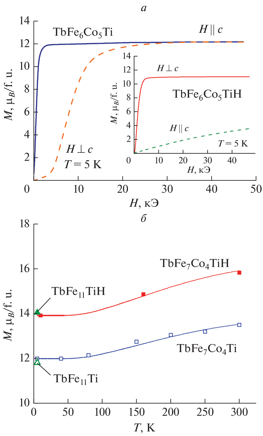 The effect of hydrogenation on the structure and magnetic properties of TbFe11– xCoxTi compounds with different cobalt content (x = 0, 3, 4, and 5) has been studied. An X-ray diffraction phase analysis was carried out and the parameters of the crystal structure of hydrides were determined. It is shown that hydrogenation leads to an isotropic increase in the unit cell volume. The experimental field and temperature dependence of the magnetization of single crystals hydride are studied in magnetic fields up to 90 kOe in the temperature range 5–300 K. The constants of magnetocrystalline anisotropy are determined.