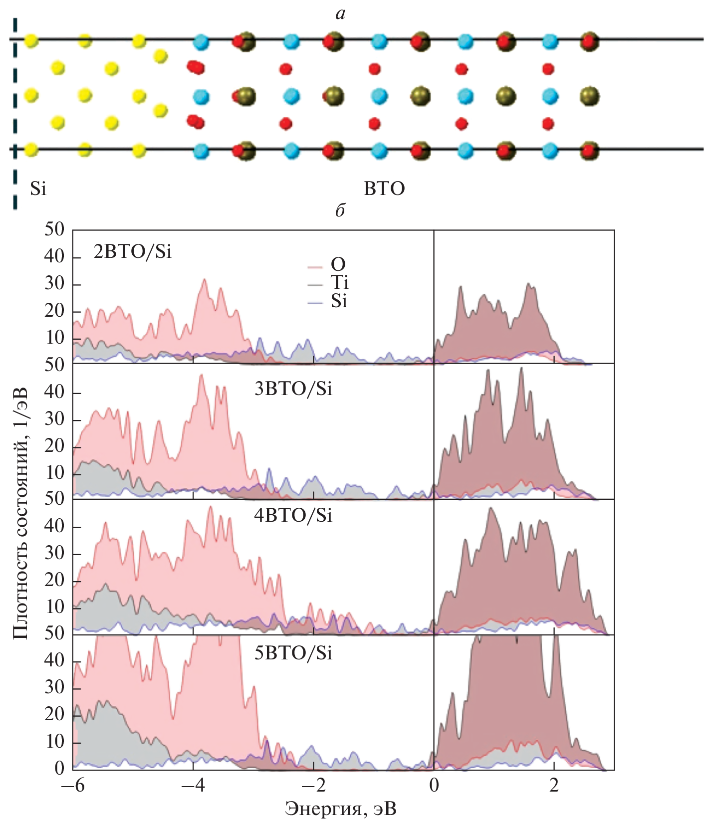 We presented ab initio calculations of a heterostructure based on the ferroelectric phase of barium titanate and silicon. The spectra of the density of states for various configurations of the heterostructure are considered, from which it follows that a conducting state can be created in a system consisting of nonconducting components.