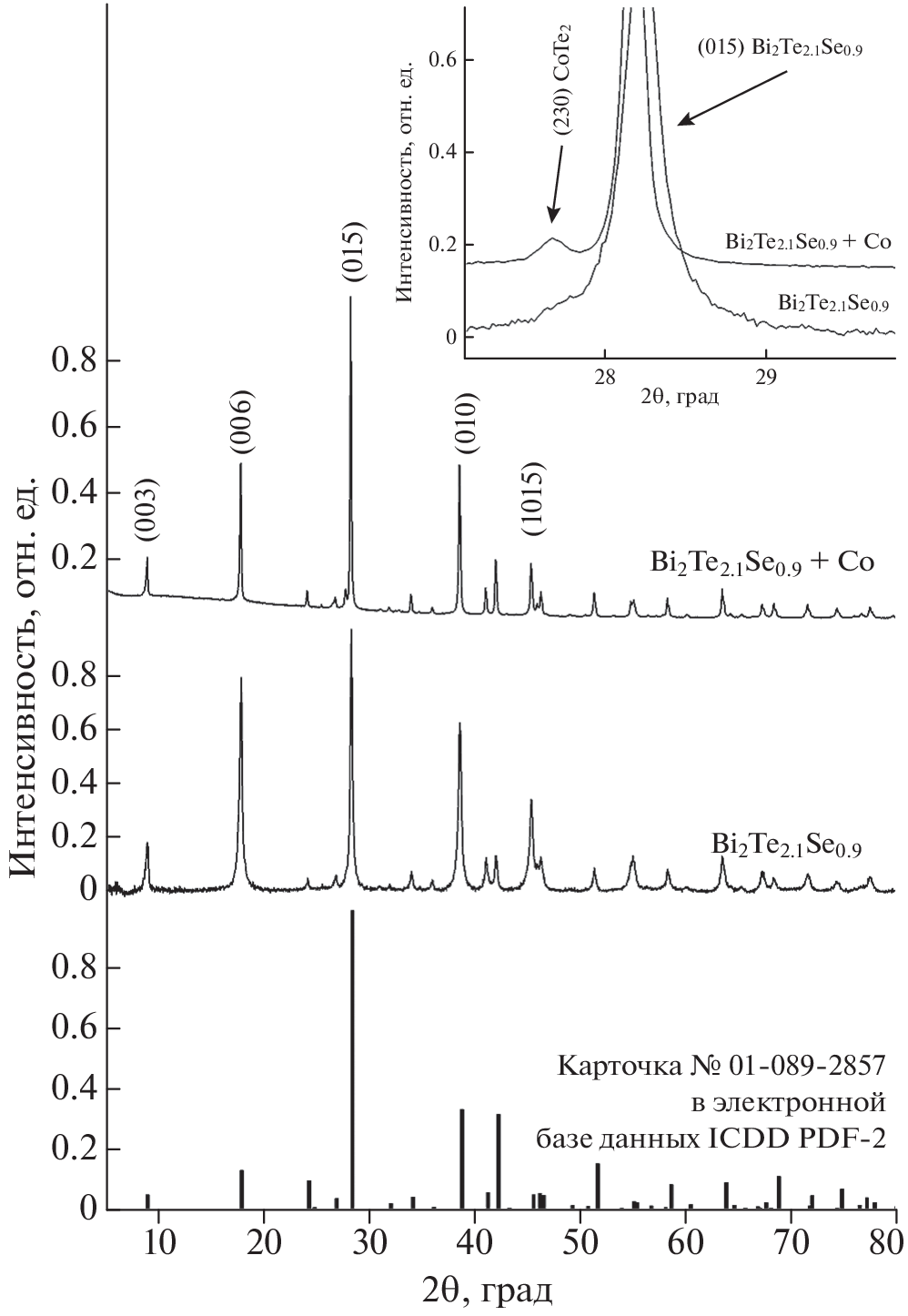 Effect of spark plasma sintering temperature on the formation of Co filler particles in the Bi2Te2.1Se0.9 matrix has been examined. Owing to high-temperature diffusion redistribution of atoms in the matrix and filler materials and chemical interaction between these materials, in the Bi2Te2.1Se0.9 + 0.33 wt % Co, core–shell filler particles (Co@CoTe2) are formed. With increasing the sintering temperature, fraction of the “CoTe2 shell” in the particles increases, while fraction of the “Co core” decreases. This behavior is due to an increasing in the diffusion coefficient of Co in the Bi2Te2.1Se0.9 matrix with increasing in the sintering temperature. The concentration profiles of the Co distribution of in the Bi2Te2.1Se0.9 matrix, governed by diffusion, are well described using Fick’s second law for diffusion from a limited source of a diffusing substance. The diffusion coefficient of Co increases with increasing un the sintering temperature in accordance with the Arrhenius law and with an activation energy of ~0.61 eV.