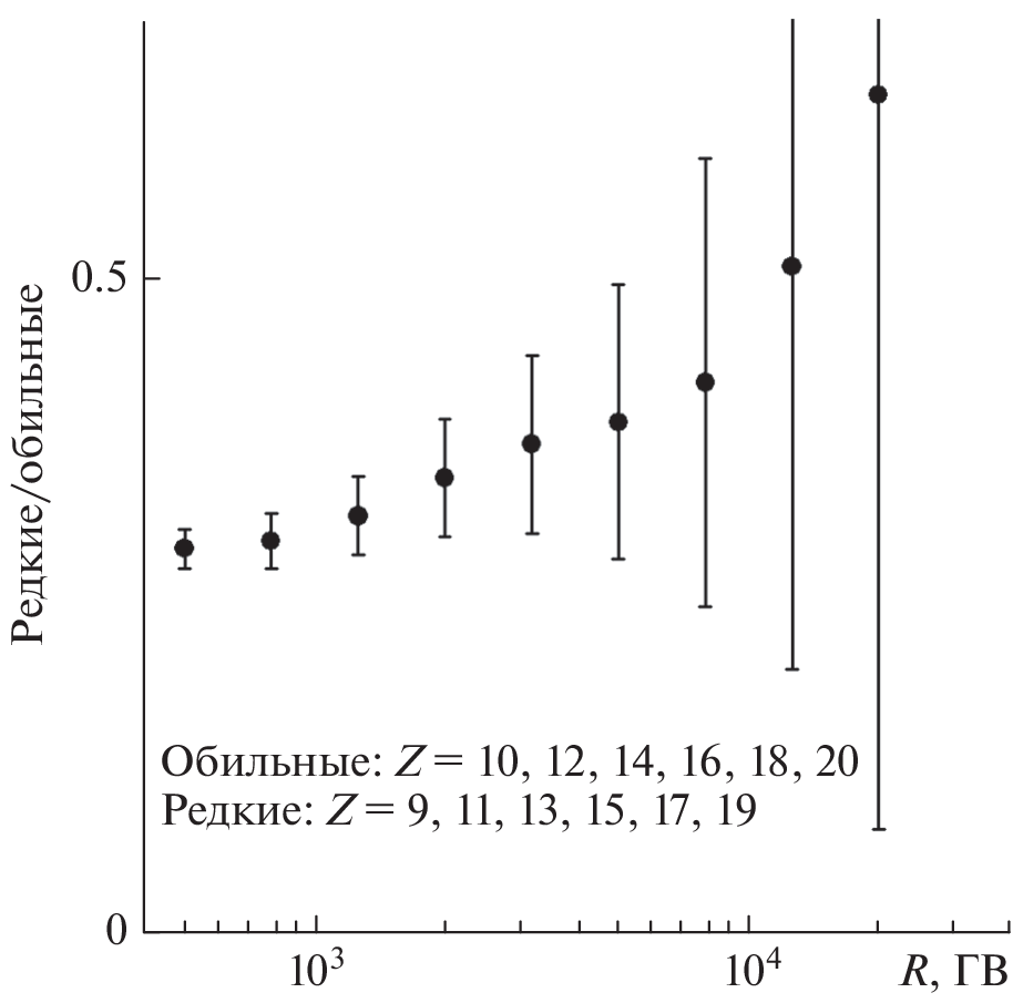 В ходе обработки данных, полученных в космическом эксперименте НУКЛОН, получены результаты, имеющие важное астрофизическое значение. С помощью пакета GALPROP решена обратная задача распространения КЛ от источника (близкой сверхновой) до наблюдателя, построен покомпонентный спектр в источнике, показано, что в источнике наблюдается систематическое изменение степенного индекса (наклона спектра), что может быть интерпретировано как неполная ионизация космических лучей в момент ускорения на фронте ударной волны сверхновой. При анализе спектров по магнитной жесткости изучены потоки ядер азота и суммарный спектр редких ядер с нечетными зарядами от 9 до 19 (F, Na, Al, P, Cl, K). Построены отношения потоков нечетных и четных ядер. Обнаружено, что спектр редких нечетных ядер более жесткий, чем спектр обильных четных ядер (Z = 10–20) в области магнитных жесткостей 300–10 000 ГВ.