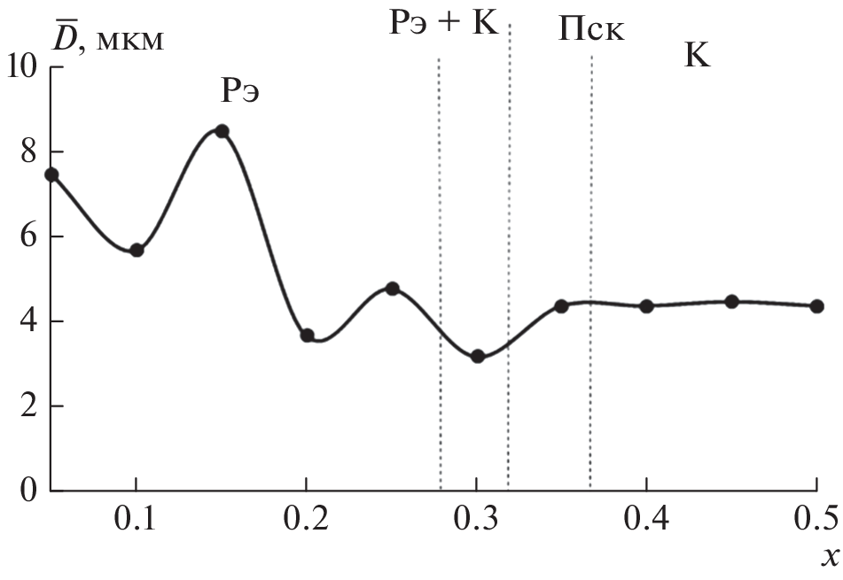 The solid solutions of the (1 – х)BiFeO3–x/2PbFe1/2Nb1/2O3–x/2PbFe2/3W1/3O3 system in the concentration range 0.05 ≤ х ≤ 0.50 were produced by solid state method and sintering using conventional ceramic technology. In the range 0.25 < x < 0.35, a morphotropic phase transition from the rhombohedral phase to the cubic phase was found. The difference in symmetry when “scaling” the material is shown. The influence of PbFe1/2Nb1/2O3 and PbFe2/3W1/3O3 on the grain structure formation was established.