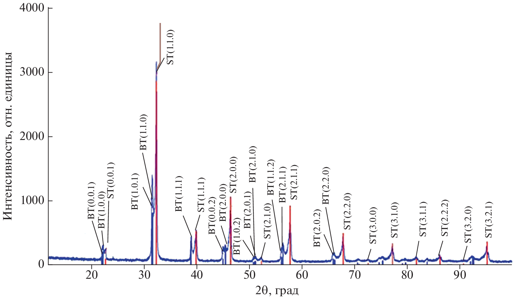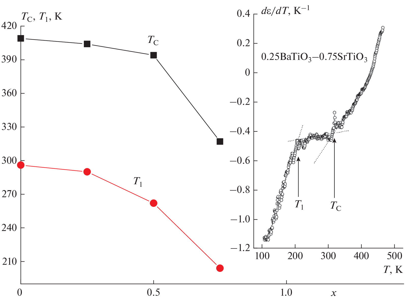 The dielectric properties of (1 – x)BaTiO3–xSrTiO3 (x = 0.0; 0.25; 0.50; 0.75 and 1.00) mixed nanocomposites, obtained by sintering the initial components at a temperature of 1273 K for 5 hours, have been studied within the temperature range of 100–500 K. X-ray analysis, performed at room temperature, showed that the composites are formed by BaTiO3 (P4mm) and SrTiO3 (Pm-3m) crystallites and do not contain Ba(1 – х)SrхTiO3 solid solutions. A decrease in the temperatures of the Amm2 → P4mm → Pm-3m phase transitions in barium titanate particles with an increase in the SrTiO3 concentration in the composite was found.