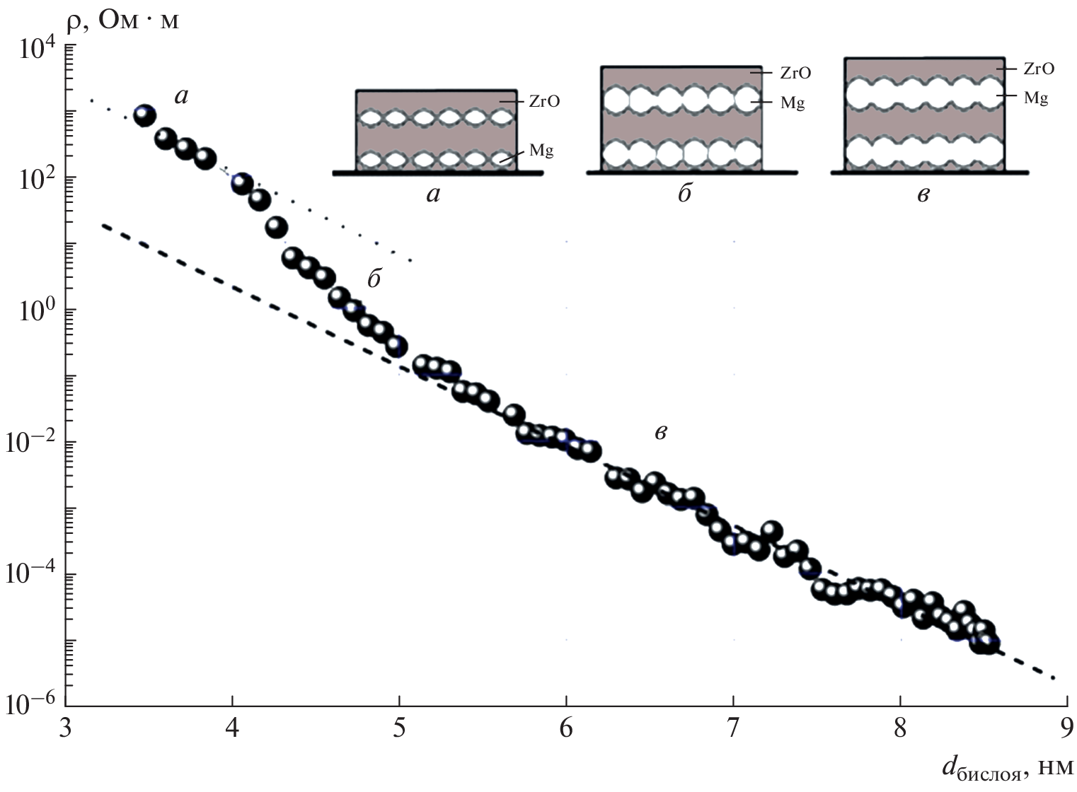Multilayer (Mg/ZrO2)52 nanostructures differing from each other in the thickness of the Mg layers and the same thickness of the ZrO2 layers were obtained by ion-beam sputtering of two targets in an argon. The thickness of one bilayer (Mg + ZrO2) varies from 3.6 to 8.5 nm. It was found that the use of zirconium dioxide prevented the oxidation of the magnesium phase. The presence of an electric percolation threshold was found when the morphology of magnesium layers changes (transition from discrete to continuous) as a result of an increase in the bilayer thickness. A change of the electrotransport mechanism in the (Mg/ZrO2)52 multilayer nanostructures upon passing through the percolation threshold has been established.