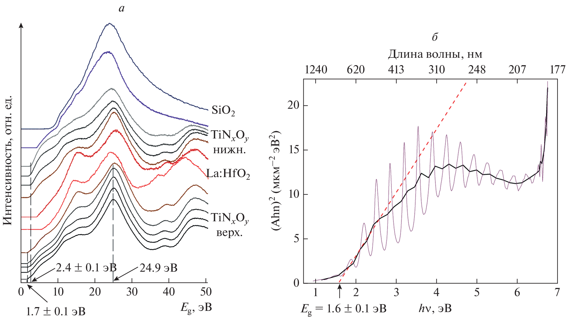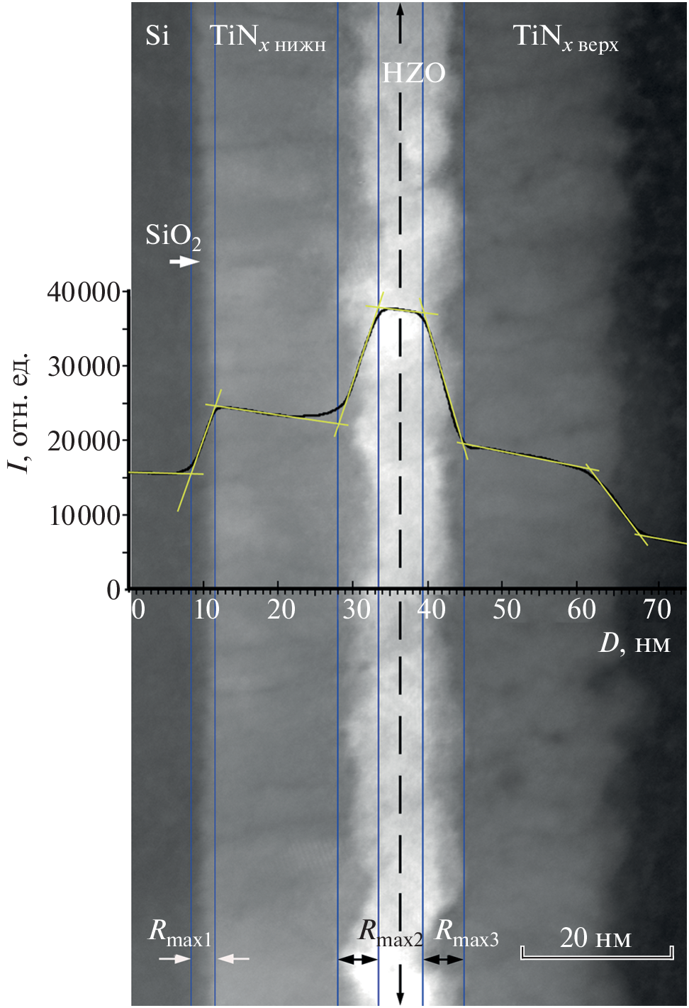 The structure and properties of TiNx electrodes obtained by plasma-enhanced atomic layer deposition in the 20 nm TiNx/10 nm La: HfO2(Hf0.5Zr0.5O)/20 nm TiNx/1 μm SiO2 system have been studied by electron microscopy and electron energy loss spectroscopy. It is shown that the electrode material has a TiNxOy composition, the band gap width varies within 1.7–2.5 eV, the resistivity is 208 μOm cm and the value of the temperature coefficient of resistance (20–100°C) is equal to –31.4 ⋅ 10–6 1/K.