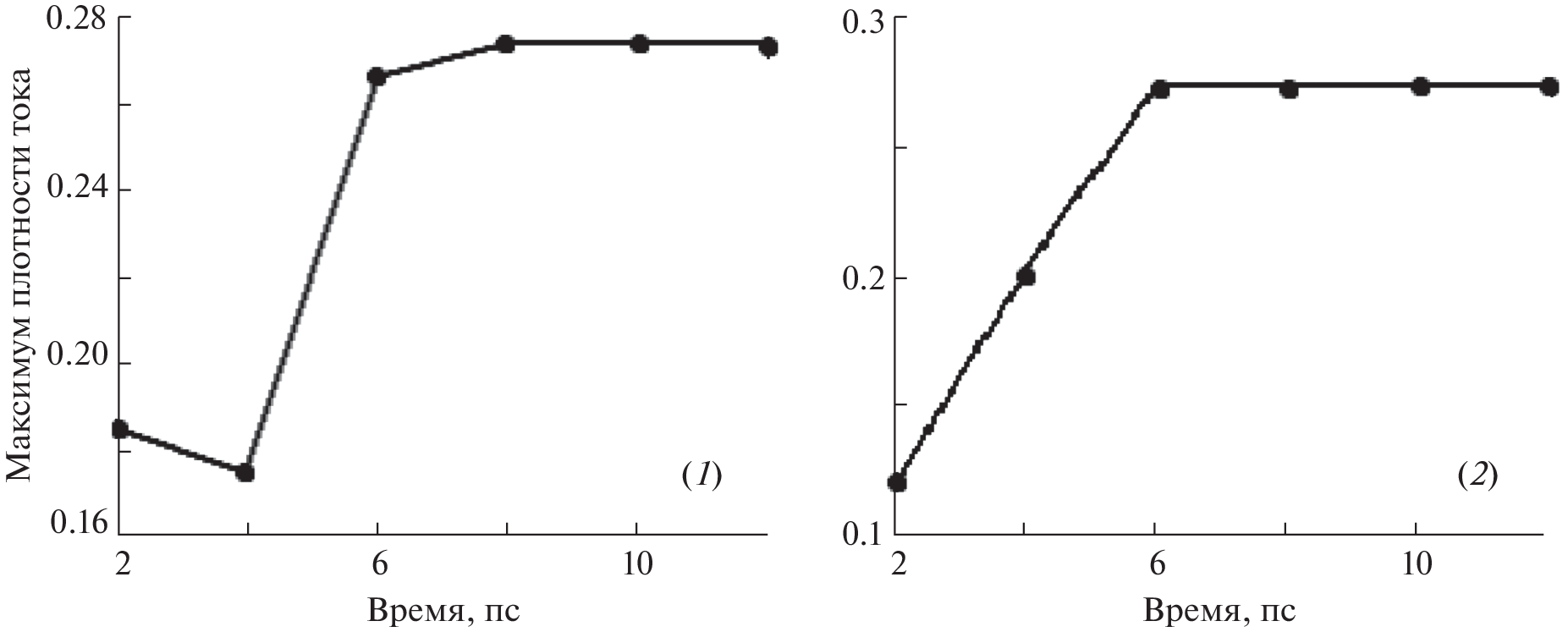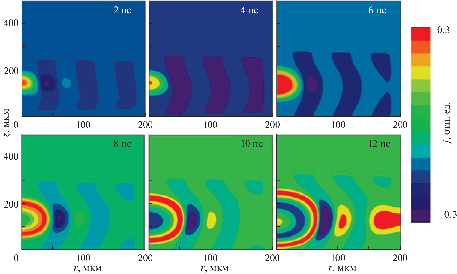 С использованием пространственного распределения напряженности электрического поля бездифракционных предельно коротких оптических импульсов Бесселя и Эйри–Бесселя построены картины временной эволюции плотности тока в нелинейном массиве полупроводниковых углеродных нанотрубок, имеющем пространственную модуляцию показателя преломления. Установлены зависимости максимального значения плотности тока от параметров модуляции показателя преломления среды.