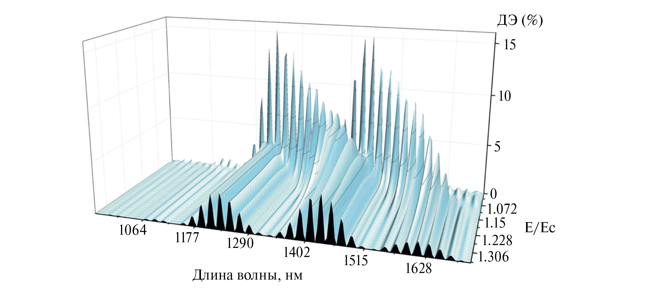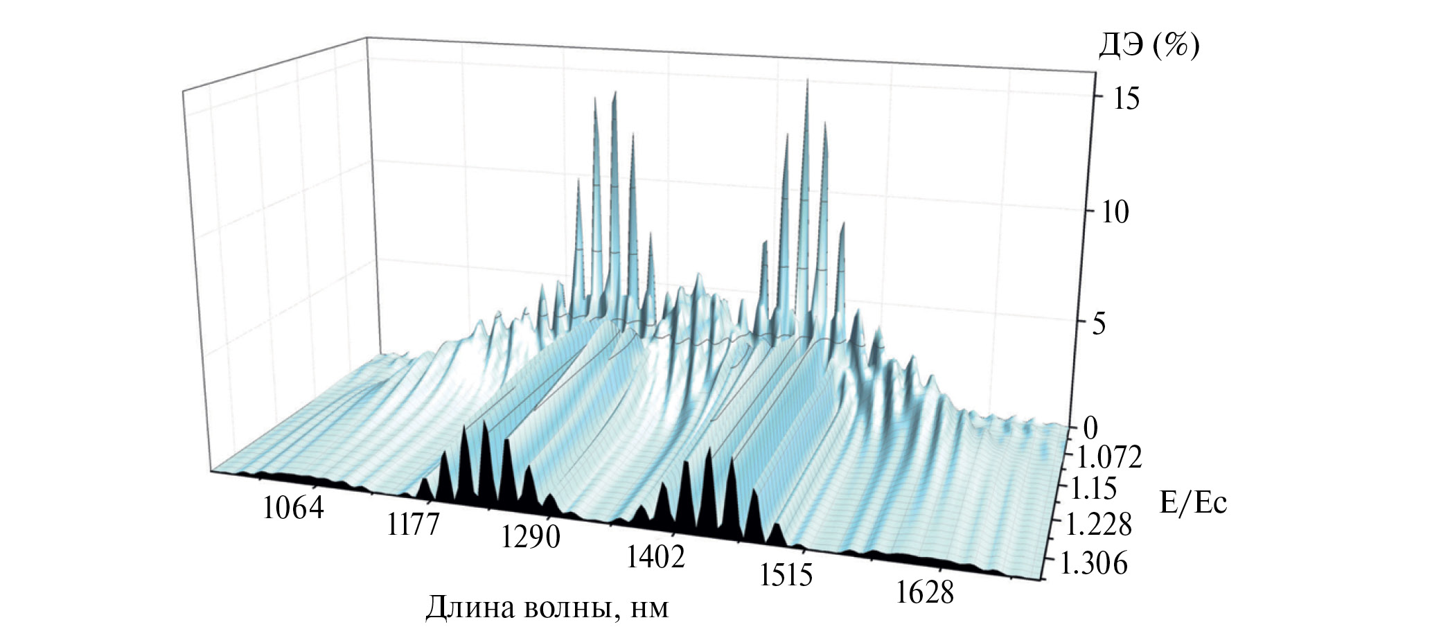 На рисунках 2 и 3 приведены зависимости ДЭ двухслойной ГДС от длины волны считывающего излучения и приложенного электрического поля на все слои с одинаковой (рис. 2) и разной полярностью (рис. 3) при считывании световой волной, поляризация которой соответствует собственным необыкновенным волнам в образце.