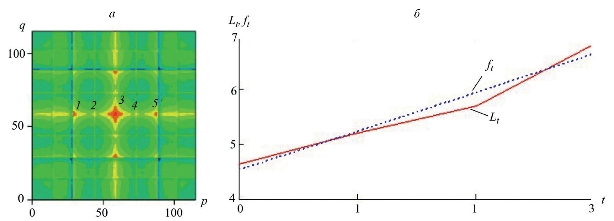 Рис. 3. Фрактальное изображение Mp, q (а). График структурной функции (б) (сплошная линия Lt), линейная аппроксимация (пунктир ft).