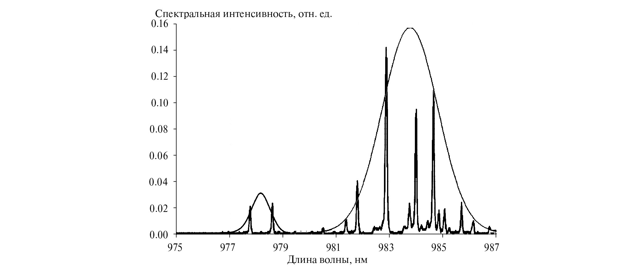 Процесс деградации МЛД рассмотрим на примере МЛД 129. На рис. 1 и 2 представлены спектры этого прибора до и после наработки. Видно, что спектр излучения МЛД 129 лежит в диапазоне, указанном в паспорте, — 980 ± 5 нм. В этом же диапазоне длин волн находится спектр излучения и остальных МЛД. Спектр в основном представляет собой эквидистантно расположенные линии, что характерно для резонатора Фабри-Перо. Это позволяет определить тонкую структуру спектра как структуру, состоящую из пиков продольных мод МЛД. В тонкой структуре наблюдаются группы продольных мод с пиками большой интенсивности. Огибающие таких групп пиков представляют собой элементы грубой структуры спектра МЛД, соответствующие разным пространственным каналам генерации, рассмотренным нами ранее в работах [5, 6]. В процессе деградации МЛД 129 наблюдаются два процесса: появление в грубом спектре двух новых огибающих групп пиков большой интенсивности и увеличение спектральной ширины линий продольных мод. На рис. 2 также видно, что внутри огибающих одновременно происходит уширение линий тонкой структуры спектра — резонансов продольных мод. Заметим, что общее число генерируемых продольных мод МЛД при деградации увеличивается и составляет для рассматриваемого лазера несколько десятков штук.