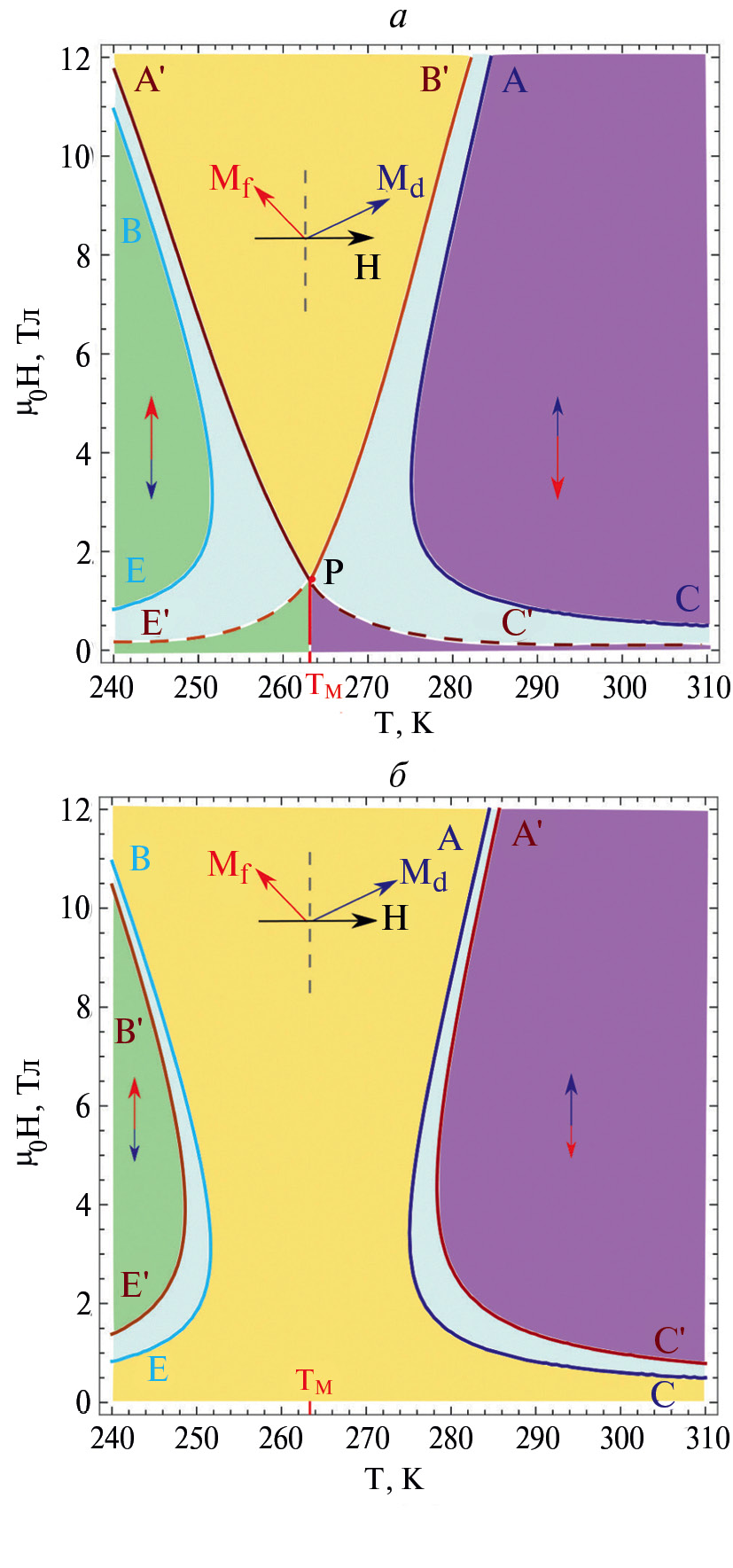 Аналогичная ситуация имеет место в случае (б), когда магнитное поле перпендикулярно легкой оси ферримагнетика. Рисунок 2б показывает, что область угловой фазы расширяется из-за наличия поверхностной анизотропии в случае, когда . Однако наиболее интересный эффект можно увидеть, если . В этом случае спины жестко закрепляются на поверхности магнетика, что может приводить к образованию зародышей новых фаз. В результате переход между коллинеарными фазами в области низких полей может происходить посредством фазового перехода первого рода. Этот эффект продемонстрирован на рис. 2а. В случае, описанном выше, линии AC и BE превращаются в A'C' и B'E'. Также следует отметить, что если анизотропия d-подрешетки выше анизотропии f-подрешетки, то возможен фазовый переход первого порядка между коллинеарной фазой θ = π и угловой фазой, поскольку трикритическая точка в этом случае будет расположена ниже температуры компенсации.
