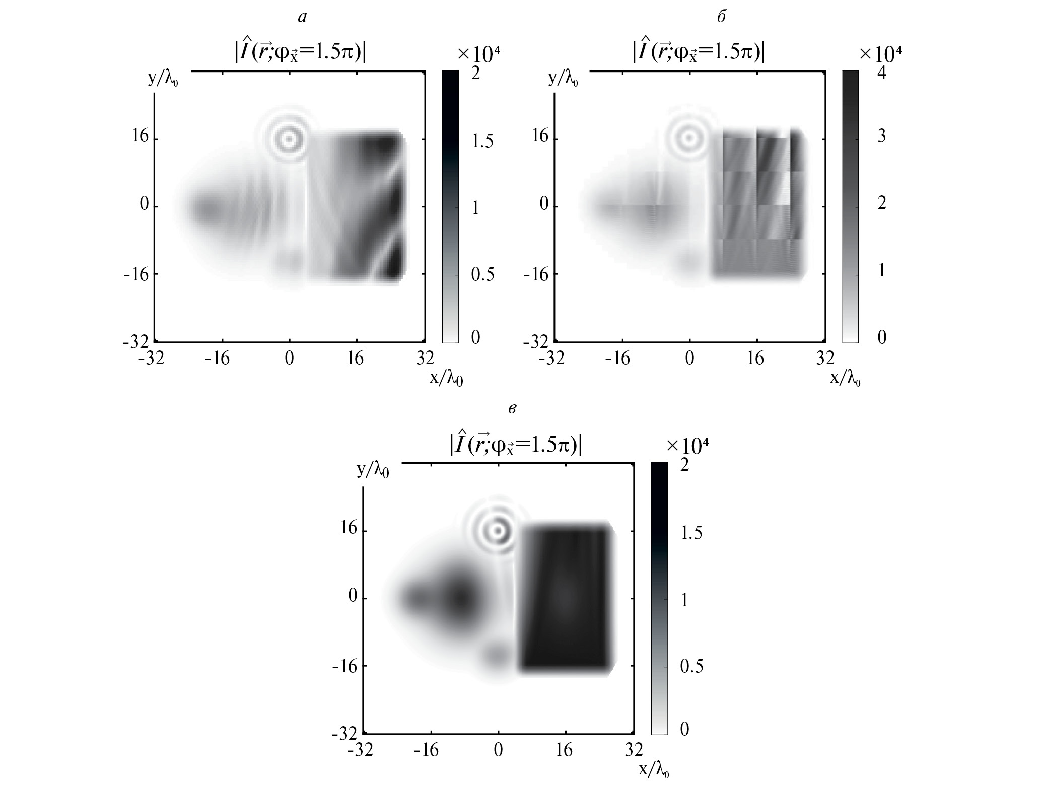 При задании конечного шага дискретизации вся область разбивалась на 82 подобластей, каждая размером . Использовался итерационный алгоритм (8), (9). Относительная итоговая точность для выполнения критерия сходимости (10) задавалась высокой: . Оценка после первой итерации (рис. 2б) содержит резкие перепады значений на границах подобластей. В итоговой оценке (после 15 итераций) такие перепады отсутствуют (рис. 2в). Принимаемые поля рассчитывались, согласно (5), для всех 512 угловых положений как излучателей, так и приемников.