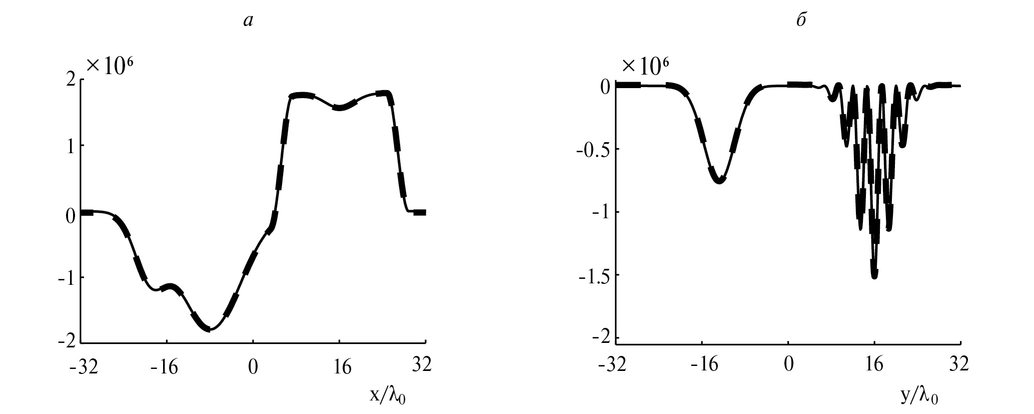 Для модели, представленной на рис. 1, рассматривалась область с размером . Дополнительный набег фазы волны при прохождении вдоль оси OX (сечение , рис. 3а) составляет: на участке с положительным контрастом , где ; – на участке с отрицательным контрастом , где . В то же время при прохождении волны вдоль разных сечений, параллельных оси OY, наибольший (по сечениям) дополнительный набег фазы составляет на участке с положительным контрастом и на участке с отрицательным контрастом. Максимальное суммарное поглощение, приводящее к уменьшению амплитуды волны в ≈ 4 раза, соответствует прохождению волны вдоль оси OY (сечение х = 0, рис. 3б). Тем самым рассеиватель достаточно сильно искажает падающие на него поля, т.е. эффекты перерассеяния волн сильны.