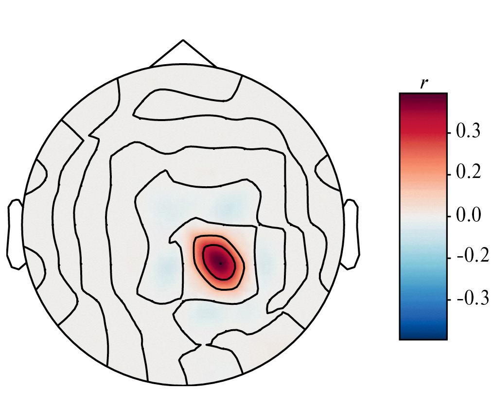 theta | Fz, r = –0.47 TP9, r = –0.42 F4, r = –0.41 AF3, r = –0.43 AFz, r = –0.43 F1, r = –0.41 AF4, r = –0.41 F2, r = –0.40 |