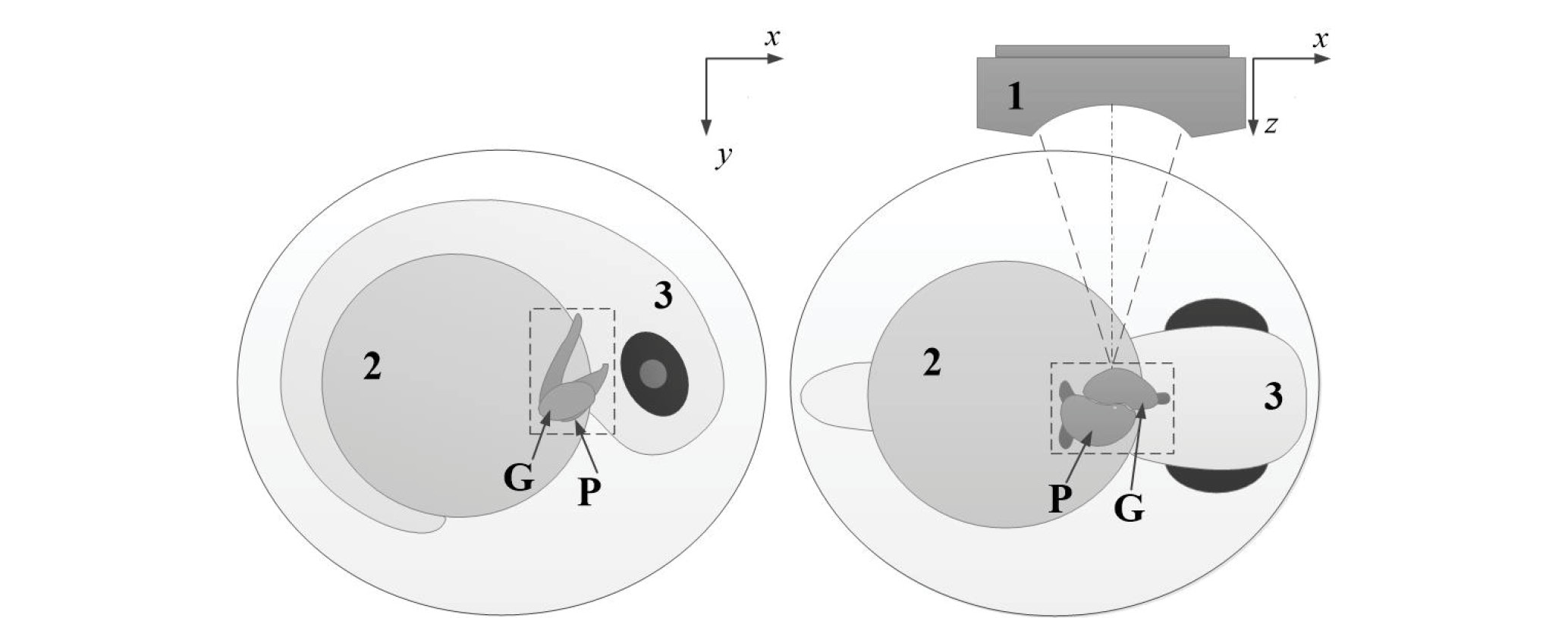 В данной работе эксперимент был проведен на эмбрионе Danio rerio в возрасте 40—48 часов после оплодотворения. На этой стадии развития зародыш хорошо сформирован, а его тело охватывает округлый желток 2, как показано на рис. 1. Сердце эмбриона, в котором можно различить желудочек G и предсердие P, располагалось в области головы 3 близко к границе с желтком. Плоскость симметрии эмбриона располагали приблизительно параллельно фокальной плоскости ультразвукового преобразователя. При такой ориентации обеспечивался боковой доступ к сердцу, причем желудочек G располагался ближе к преобразователю 1. Для обеспечения относительной неподвижности эмбриона во время измерений его сначала анестезировали, помещая в 0.2% раствор лидокаина на 1 минуту перед загрузкой в иммерсионную ячейку микроскопа. Заметных отклонений в развитии организма в последующие дни после эксперимента выявлено не было.