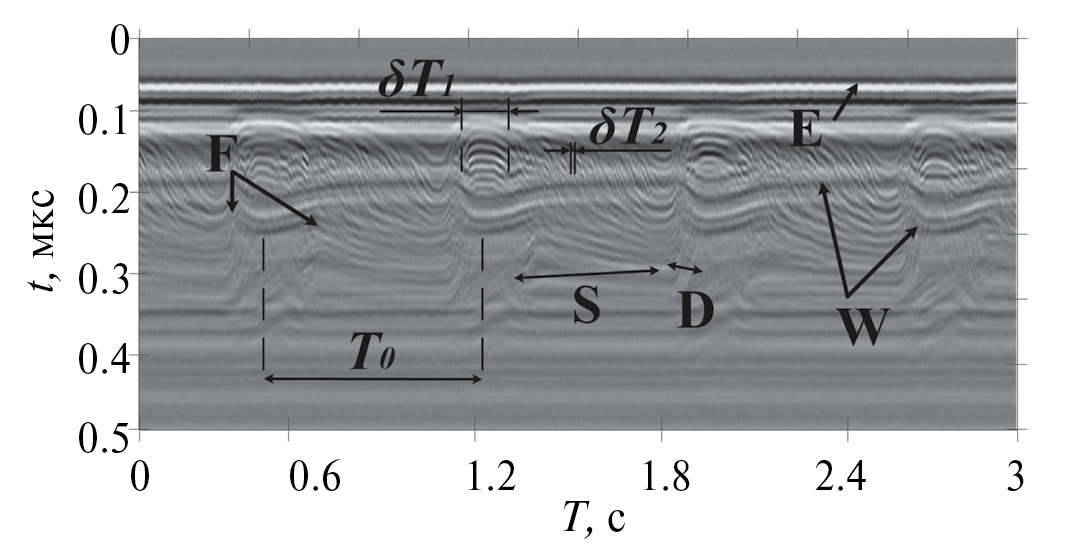 На рис. 2 представлен типичный М-скан s(t, T), измеренный приблизительно в центре сердца в точке x = 112 мкм в момент времени с начала эксперимента Te = 71 мин. Значения полученных сигналов представлены градациями серого цвета. На полученных изображениях можно распознать характерное поведение ультразвукового сигнала, которое демонстрирует периодичность биений сердца с периодом T0 = 0.78 с.