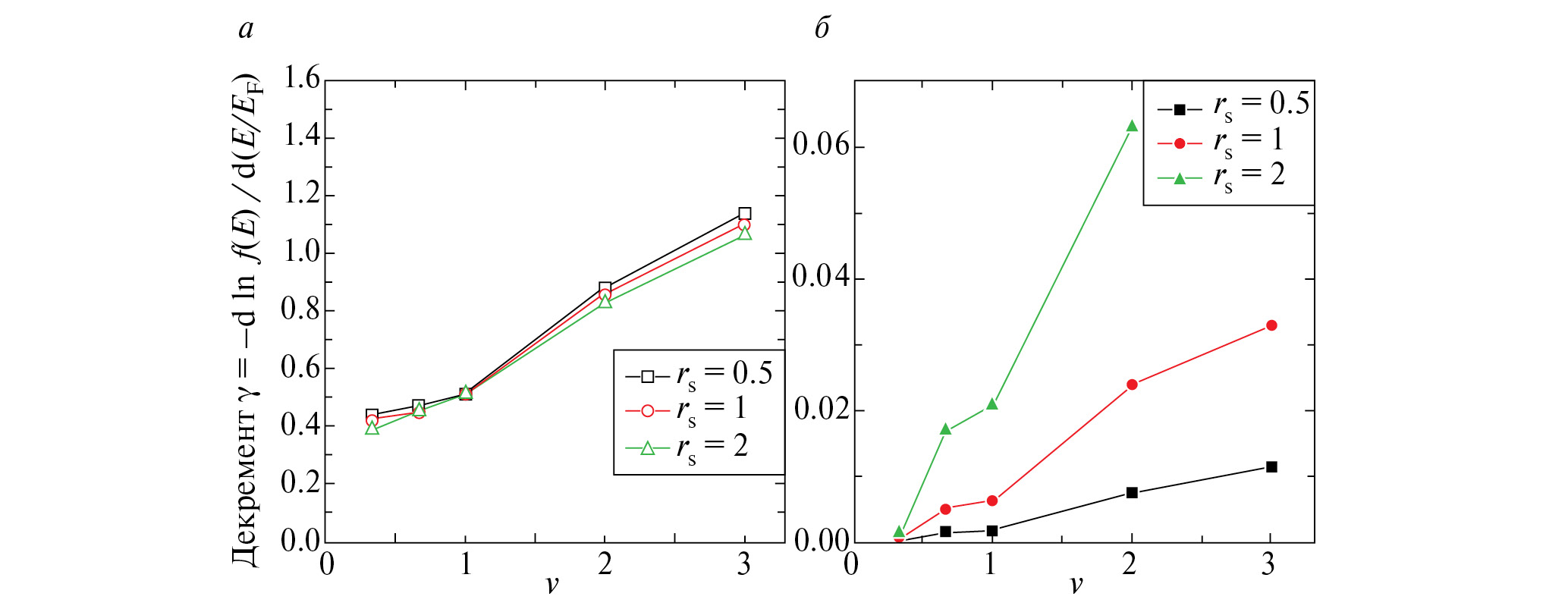 Аналогичные функции распределения электронов для разных ν имеют существенные отличия: при фиксированном rs декремент затухания функции распределения при E > EF существенно возрастает от ν (рис. 2a), а величина скачка Мигдала Z для малых факторов заполнения значительно меньше отличается от единицы, чем для нулевого магнитного поля при тех же rs, для которого применима аппроксимация 1–Z ≈ 0.13rs [5]. Второй неожиданный результат заключается в том, что при малых ν зависимость (1–Z) от фактора заполнения близка к линейной (рис. 2б). Для ν ≥ 4 и rs ~ 1 применяемая численная схема не обеспечивает сходимости, и потому не может быть проверена асимптотика скачка Мигдала.