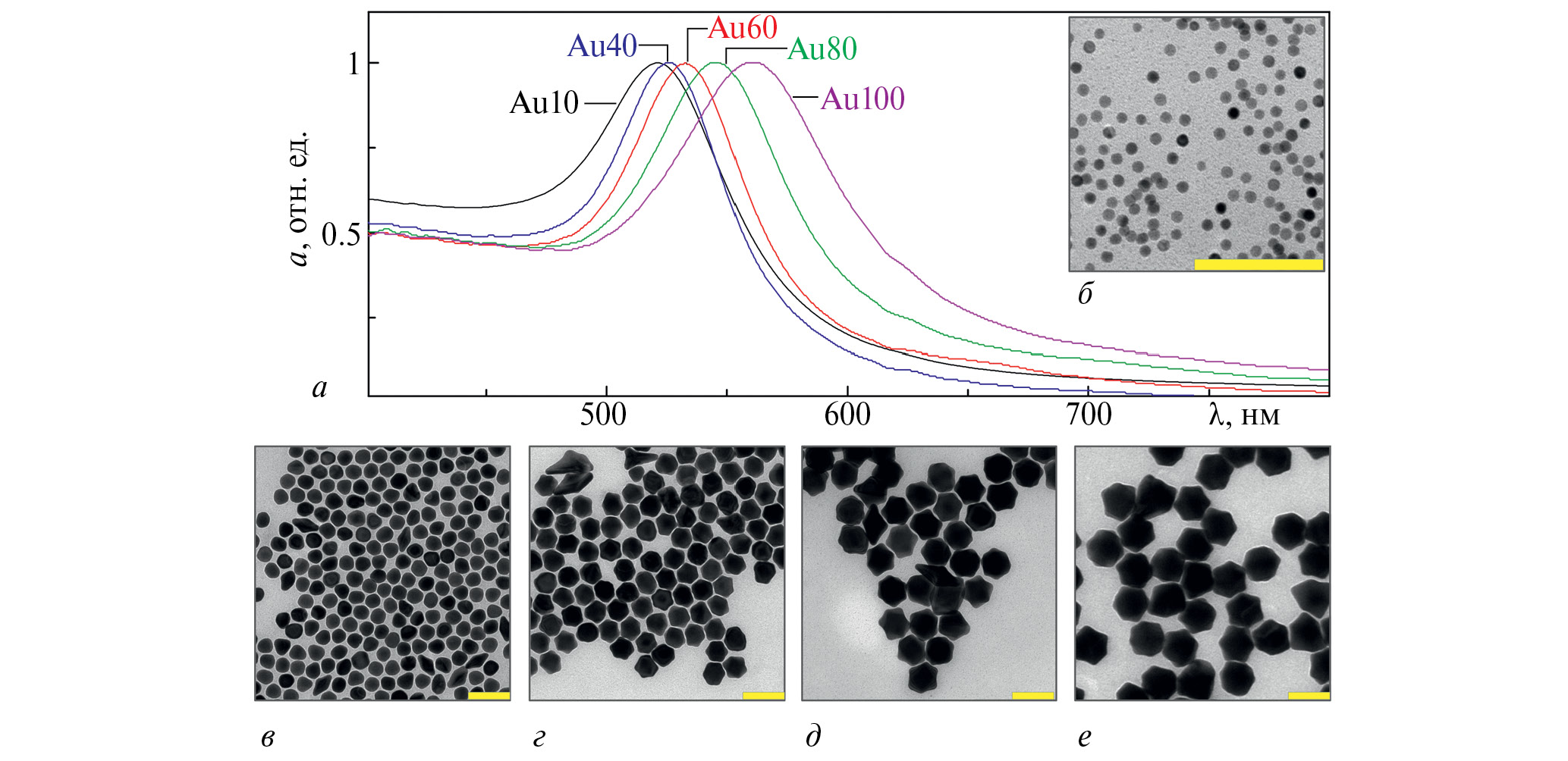 Типичный спектр экстинкции свежесинтезированных коллоидов, используемых для приготовления плазмонных платформ, представлен на рисунках 1а и 2а. На рис. 1б-е и 2б-е показаны ПЭМ-изображения наночастиц, иллюстрирующие их геометрию. Средние размеры частиц, определенные путем обработки ПЭМ-изображений, и значения максимумов плазмонного резонанса, приведены в табл. 1.
