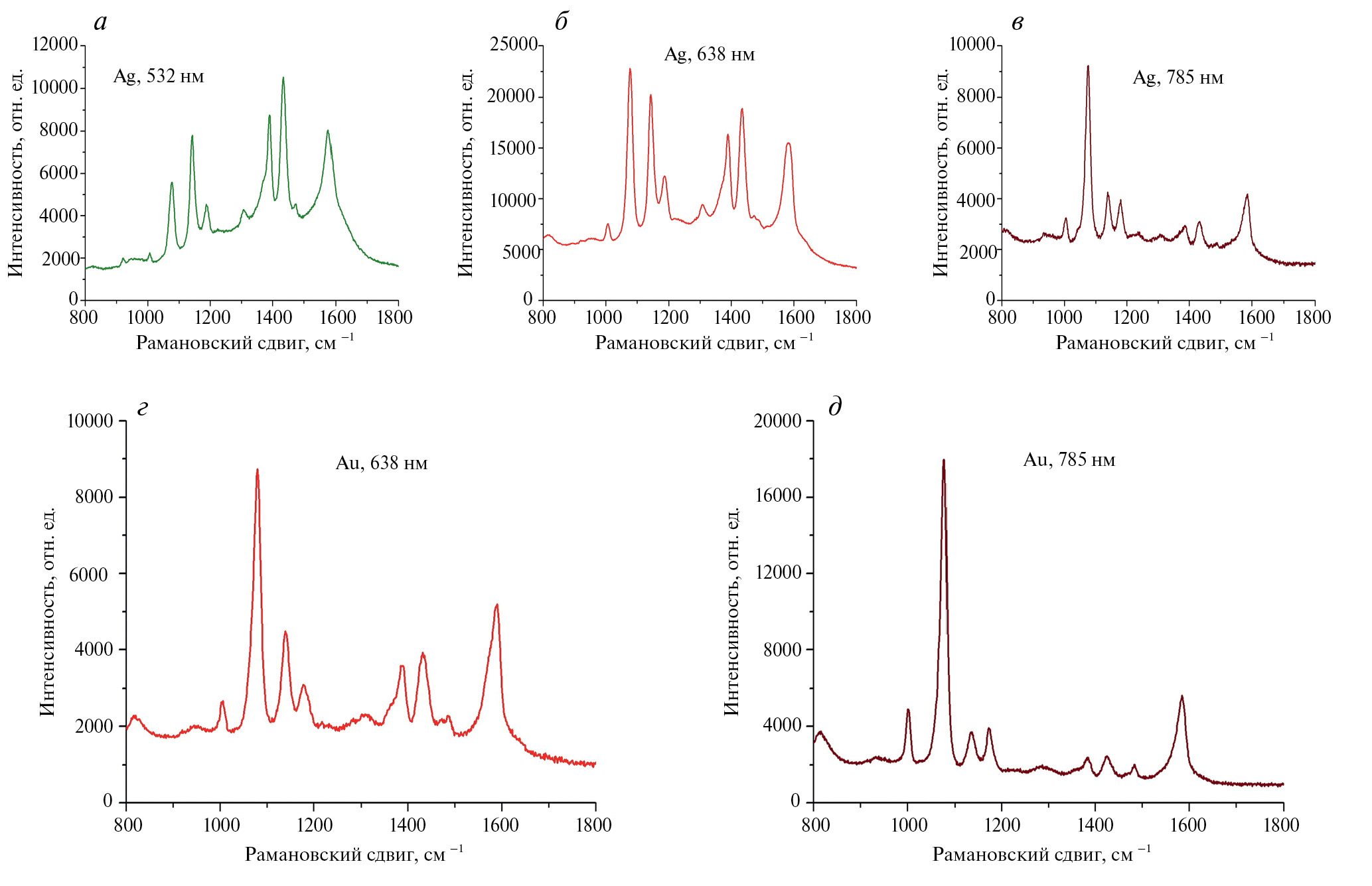 Рис. 3. ГКР-cпектры 4-АВТ: наночастицы серебра, синтезированные по методике Леопольда–Лендла, λвозб = 532 нм (а); наночастицы серебра, синтезированные по методике Леопольда–Лендла, λвозб = 638 нм (б); наночастицы серебра, синтезированные по методике Леопольда–Лендла, λвозб = 785 нм (в); наночастицы золота с размером 60 нм, λвозб = 638 нм (г); наночастицы золота с размером 60 нм, λвозб = 785 нм (д)