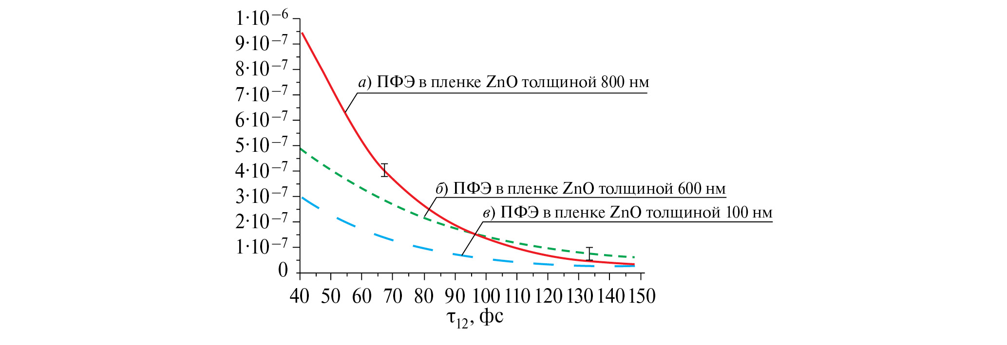 Структура энергетических уровней экситонов в ловушках дает возможность возбуждать переходы на длине волны 400 нм в режиме двухфотонного поглощения при помощи импульсного лазера, излучающего на длине волны 800 нм и исследовать их динамику методами спектроскопии фотонного эха. Величина времени релаксации, измеренная по кривой временного спада интенсивности фотонного эха, составляющая при комнатной температуре значения от несколько сотен фемтосекунд до единиц пикосекунд, характеризует время жизни экситонных состояний. Эти величины можно использовать в качестве оценочных при проектировании, например, оптических эхо-процессоров, которые могли бы функционировать при комнатной температуре за счет использования полупроводниковых наноструктур. Демонстрация возможности использования для этих целей тонких пленок оксида и оптимизация режимов работы приборов, основанных на эффекте фотонного эха, являются важными практически значимыми задачами. Изучение влияния параметров синтеза тонких пленок оксида цинка (например, концентрации кислорода в рабочей камере) дает возможность варьировать ширину запрещенной зоны оксида цинка для определения характеристик, обеспечивающих эффективные режимы формирования сигналов фотонного эха и работы устройств обработки информации на его основе [7–10].