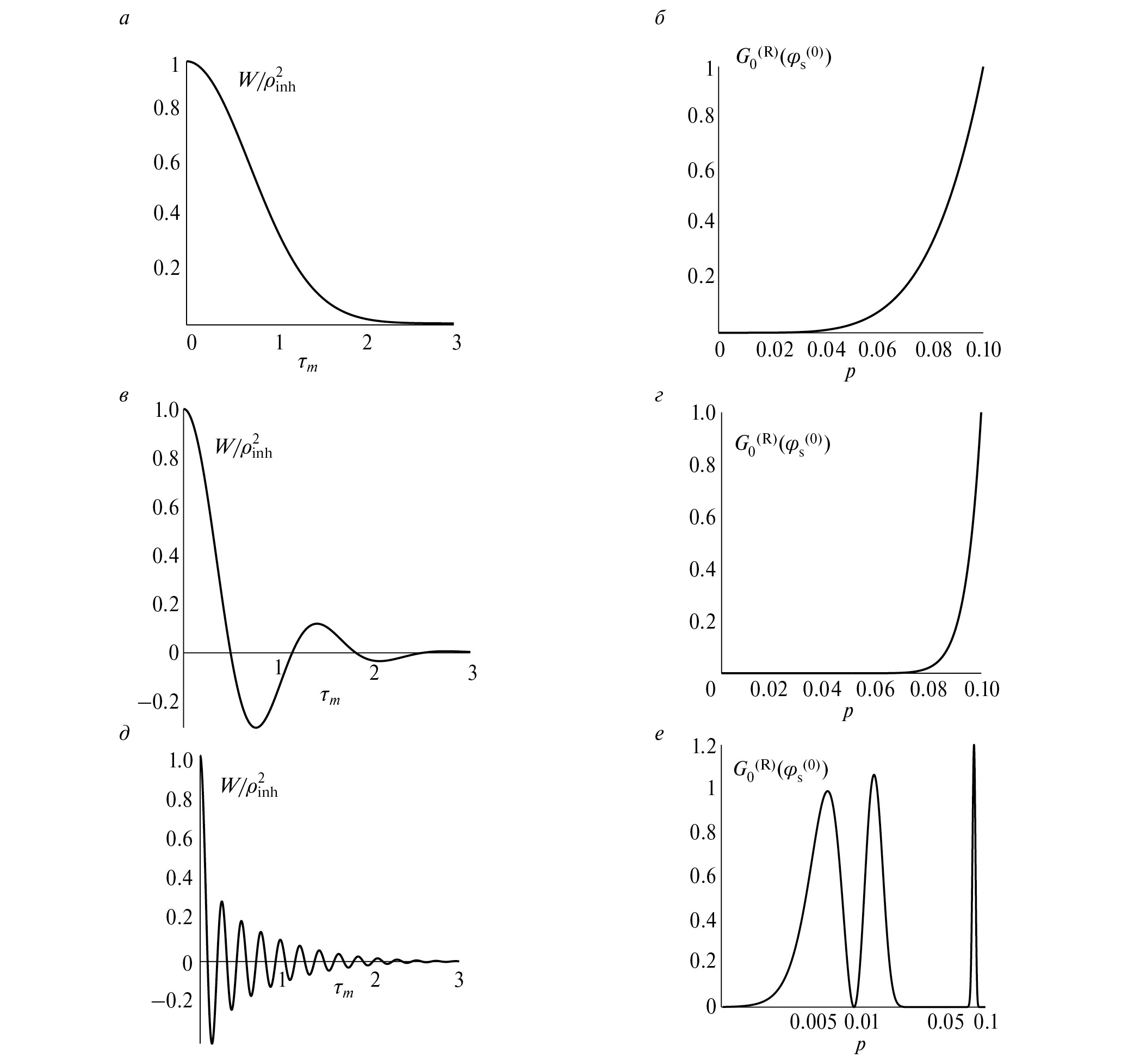 Рис. 1. Коррелятор (3), (14) – (23), (27), описывающий ансамбль реализаций статистической неоднородности (а), усреднение по которому дает угловое распределение (9) при детерминированной структуре нарушенного слоя F(x3) в виде (24) всюду, удовлетворяющее рэлеевскому закону рассеяния в соответствии с топологическими законами рассеяния в рэлеевском пределе (25), (26). NR = 0 (25); τm = τ / amax; N(r) = 1, (17), , m11 = 0, (17), . Коэффициент Пуассона σ = 0.25, d / amax = 1, q1 = 1 (24) и (22) всюду. Рэлеевский закон рассеяния для углового распределения рассеяния , где всюду, если не оговорено иное, p0 = 0.1, при корреляторе, представленном на рис. 1а (б). Коррелятор (3), (14) – (23), (27), который дает нарушение рэлеевского закона рассеяния в соответствии с топологическими законами (25), (26). NR = 6; N(r) = 1, , , m11 = 3, , (в). Нарушение рэлеевского закона рассеяния. для коррелятора, представленного на рис. 1в; p0 = 0.1 (г). Коррелятор (3), (14) – (23), (29), который дает осцилляции рассеяния в рэлеевском пределе. N(r) = 1, , , , , m11 = 1, m12 = 31, m13 = 25, , (д). Осцилляции рассеяния в рэлеевском пределе. Нарушение рэлеевского закона рассеяния, представленного на рис. 1б. для коррелятора, представленного на рис. 1д; p0 = 0.015 (е)