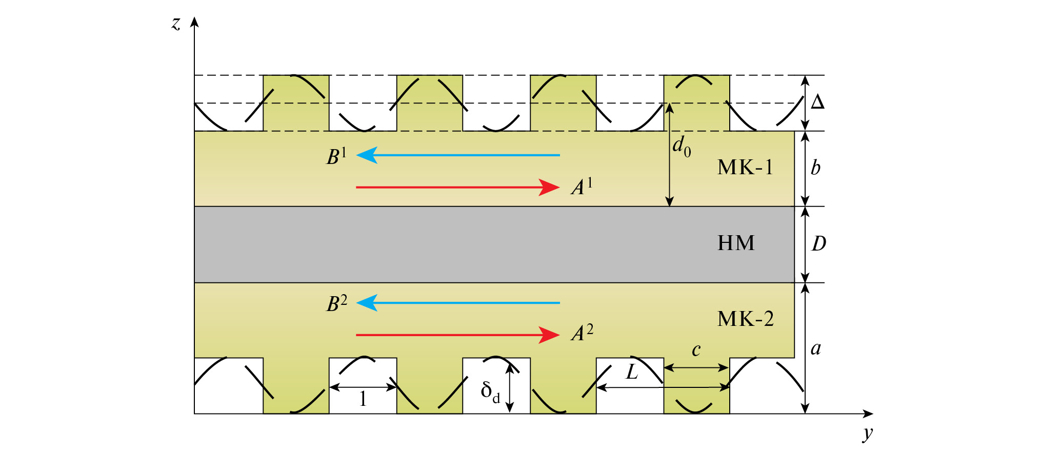 Перейдем к рассмотрению периодической структуры, состоящей двух магнонных кристаллов (МК-1 и МК-2), разделенных слоем НМ. МК-1 и МК-2 представляют собой ферромагнитные пленки, на поверхность которых нанесена периодическая структура с периодом L в виде канавок глубиной ∆ (b = a – ∆ – толщина пленки в области канавки, a – толщина пленки в области столбика), шириной l (ширина столбика c = L – l), как показано на рис. 2.