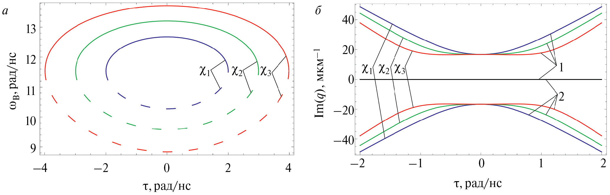 На рис. 3б приведены зависимости мнимых частей добавок Im(q)) при от величины и полярности СТ, построенные с использованием соотношения (11), при разных значениях связи между слоями YIG χ. Видно, что в отсутствии СТ τ = 0 значение Im(q) > 0 для прямых волн (кривые 1) и Im(q) < 0 для отраженных волн (кривые 2), что соответствует затуханию прямых волн и формированию ЗЗ. При увеличении СТ модуль Im(q) увеличивается, т.е. растет глубина ЗЗ. При изменении полярности СТ тенденция сохраняется.