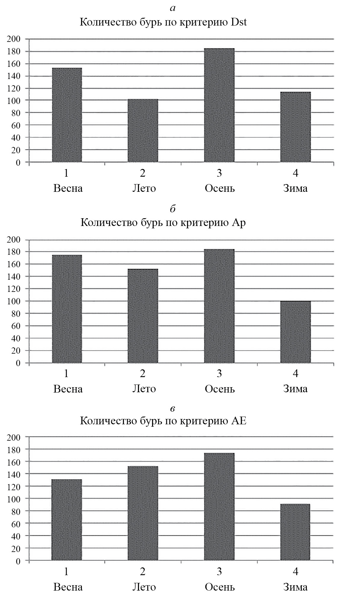 Рис. 1. Сезонное распределение количества Dst-бурь (а), ap-бурь (б) и AE-бурь (в)