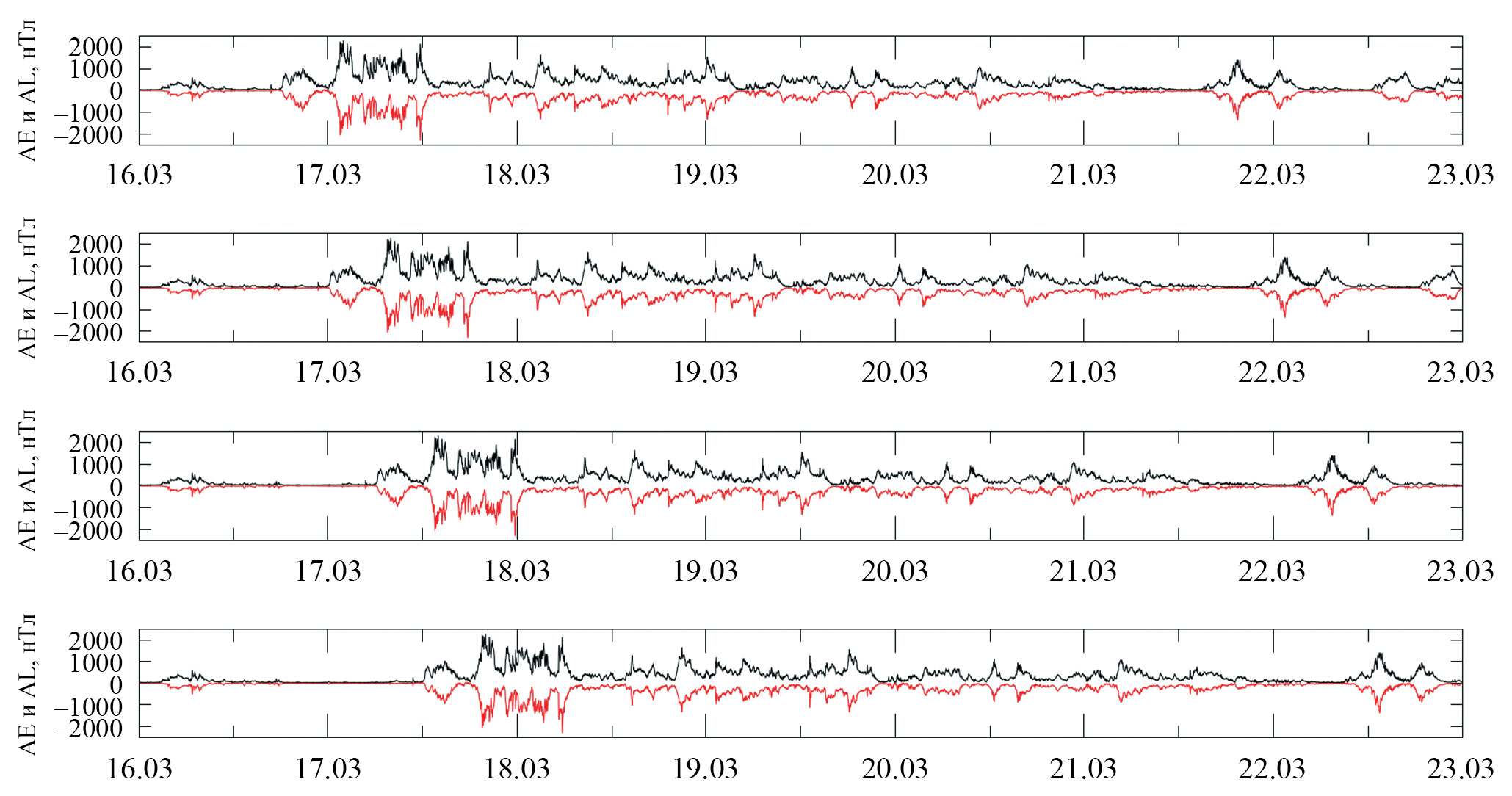 Рис. 1. Вариации индексов геомагнитной активности AE и AL для смещенных по времени моментов начала бурь, сверху вниз для 00 UT, 06 UT, 12 UT, 18 UT соответственно