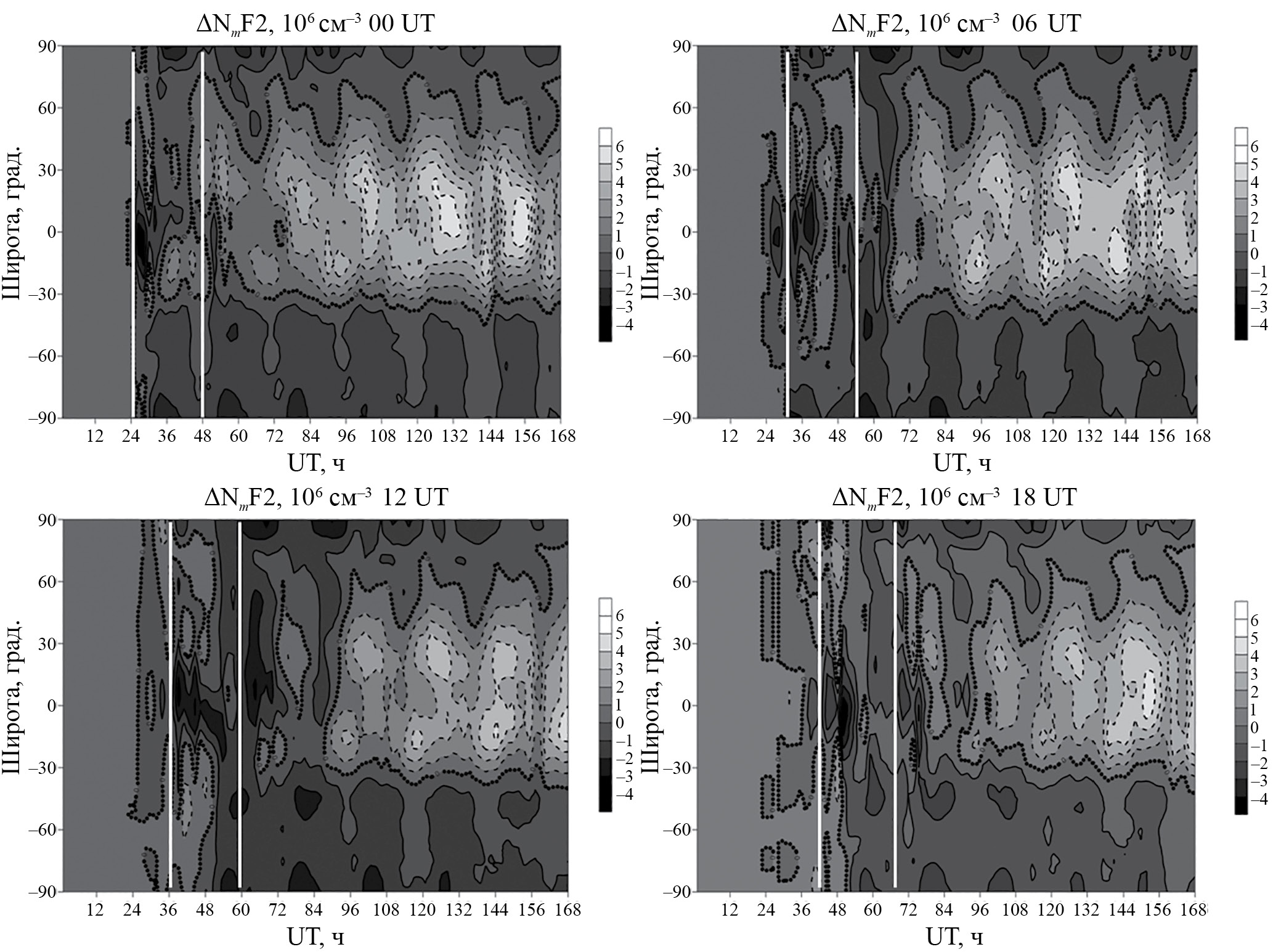 На рис. 2 представлены зонально-усредненные возмущения электронной концентрации в максимуме F2 слоя ионосферы, NmF2, для бурь с выбранными моментами начала по UT. Прежде всего следует отметить то, что для всех представленных бурь положительные эффекты на фазе восстановления сосредоточены в экваториальной зоне с частичным смещением в северное полушарие. Интенсивность и широтная протяженность эффектов последействия больше для бурь с временем начала в 00 и 06 UT. В главную фазу всех рассматриваемых бурь можно выделить следующие сходства в поведении зонально-усредненных возмущений NmF2: 1) отрицательные ∆NmF2 в экваториальной зоне в период 0—12 ч после начала бурь; 2) положительные ∆NmF2 на средних широтах, возникающие в течение первых 7 ч после начала бурь. Основными различиями в возмущениях NmF2 на главной фазе бури являются: 1) в период от 0 до 10 ч после начала бури для бурь с временем начала в 12 и 18 UT присутствие положительных возмущений в высоких и средних широтах, которые отсутствуют для бурь с моментами начала в 00 и 06 UT (при этом длительность и интенсивность этих возмущений больше для бури с началом в 12 UT); 2) на более поздних этапах бурь с моментами начала в 00 и 06 UT происходит формирование положительных возмущений в экваториальной зоне и на средних широтах северного полушария, тогда как для бурь с моментами начала в 12 и 18 UT формируются отрицательные возмущения; 3) в высокоширотных областях во время бурь с моментами начала в 00 и 06 UT формируются отрицательные возмущения в течение практически всей главной фазы, тогда как для бурь с моментами начала в 12 и 18 UT формируются положительные возмущения в течение первых 12 ч, после чего следует отрицательная фаза.