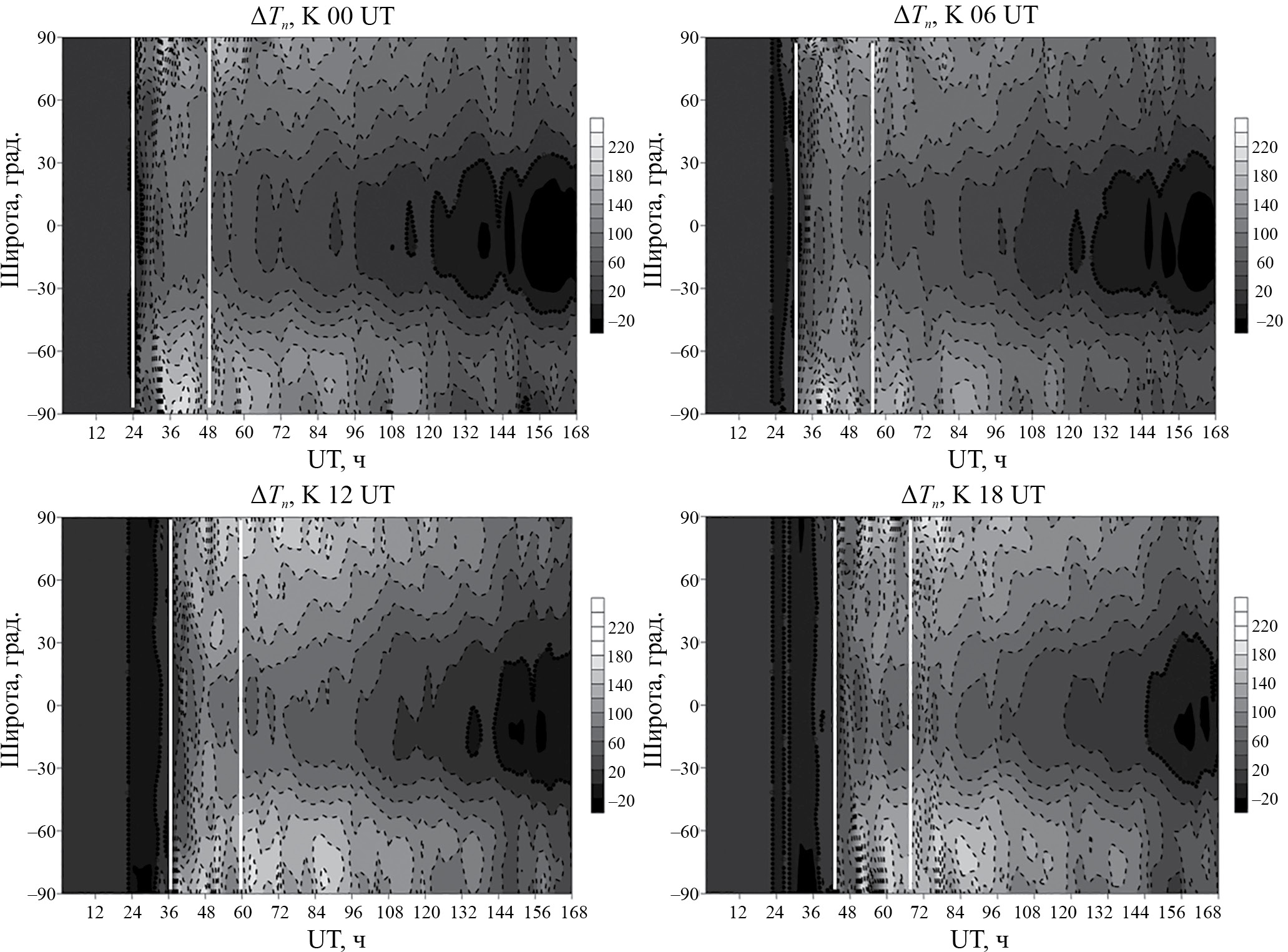 Эффекты геомагнитных бурь в верхней атмосфере являются следствием нагрева термосферы, вызывающего появление дополнительного термосферного ветра к экватору и перестройку нейтрального состава термосферы, а также усиления электрического поля магнитосферной конвекции в главную фазу геомагнитной бури. Наши расчеты показали, что зонально-усредненные возмущения компонент электрического поля в ионосфере пренебрежимо малы вследствие усиления как восточного, так и западного электрического поля во время бури. Поэтому в данной работе мы не приводим результатов модельных расчетов зонально-усредненных возмущений электрического поля в ионосфере, а показываем результаты расчетов зонально-усредненных возмущений термосферных параметров для всех рассмотренных бурь. На рис. 3 представлены зонально-усредненные возмущения Tn для бурь с разными моментами начала. В зависимости от времени начала бурь изменяются как широтная протяженность, так и интенсивность этих возмущений. Самые слабые возмущения приходятся на бурю с моментом начала в 06 UT, а самый сильный разогрев термосферы в главную фазу бури происходит при начале бури в 00 UT. Во время бурь с моментами начала в 12 и 18 UT формируются наиболее интенсивные возмущения Tn на вторые и третьи сутки фазы восстановления. Такое поведение возмущений Tn для разных бурь определяет различия в появлении положительных/отрицательных возмущений NmF2 на вторые и третьи сутки фазы восстановления.