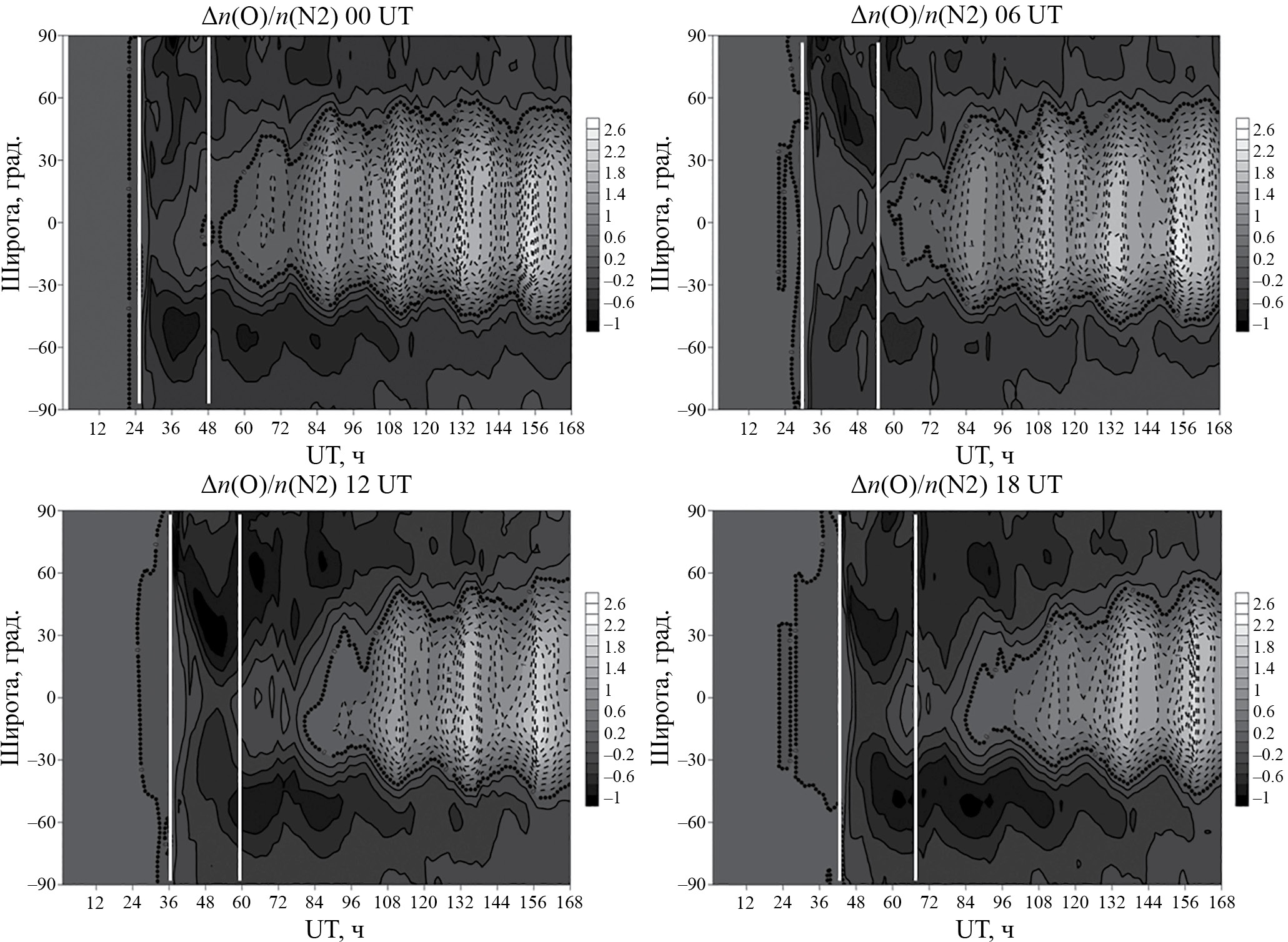 На рис. 5 представлены зонально-усредненные возмущения n(O)/n(N2) для бурь с разными моментами начала. В главную фазу всех рассматриваемых бурь формируются отрицательные возмущения n(O)/n(N2) с наименьшими отрицательными возмущениями в области экватора и максимальными отрицательными возмущениями в области широт 30°—60° с.ш. и ю.ш. Формирование отрицательных возмущений NmF2 в интервале от 12 до 23 ч после начала бурь с моментами начала в 12 и 18 UT связано с отрицательными возмущениями n(O)/n(N2). Положительные возмущения на фазе восстановления сосредоточены на экваторе и низких широтах. В целом, для всех бурь положительные возмущения NmF2 на фазе восстановления связаны с возмущениями n(O)/n(N2), как отмечалось ранее [6]. При этом интенсивность и широтный охват этих возмущений несколько больше для бурь с временем начала в 00 и 06 UT, что связано с пространственно-временным распределением возмущений нейтральной температуры, рассмотренным выше. Это объясняет соответствующую картину эффектов последействия в NmF2.