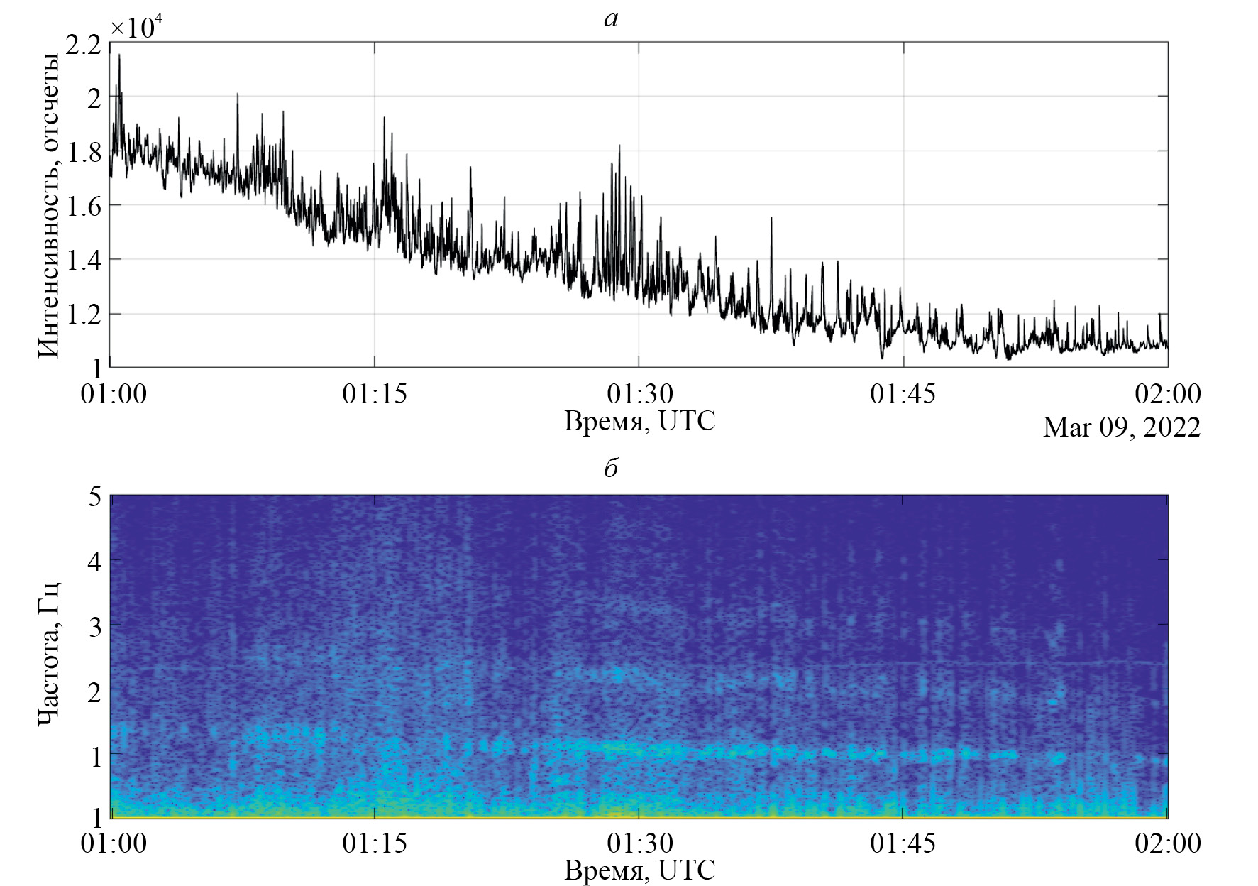 Характерная временная структура ППС проявляются в чередовании фаз “включено” (увеличение яркости пульсирующего пятна) и “выключено”. При этом длительности фаз, как правило, не являются фиксированными. Зачастую на фазе “включено” присутствует внутренняя модуляция на более высокой частоте (3—5 Гц) [8]. Анализ отдельных фрагментов ППС, регистрируемых изображающим фотометром на полигоне “Верхнетуломский”, в целом, подтверждает наличие такой структуры, как и значительного разнообразия пространственно-временных форм ППС [9]. Зачастую временная структура пульсирующих сияний довольно сложна и невозможно выделить какую-то доминирующую и долгоживущую частоту пульсаций, поэтому случаи регистрации длительных квазипериодических колебаний крайне интересны. Для примера рассмотрим измерения 9 марта 2022 г. На рис. 1 показана спектрограмма, полученная за 1.5 ч работы фотометра с временным разрешением 40 мс. Присутствует постоянная модуляция с плавно уменьшающейся со временем частотой, а также кратные частоты, говорящие об ангармоничном характере пульсаций. В начале появления модуляции основная частота составила 1.1 Гц, и за 1.5 ч она уменьшилась до 0.64 Гц. Таким образом, скорость измерения частоты составляет ~0.3 Гц/ч.