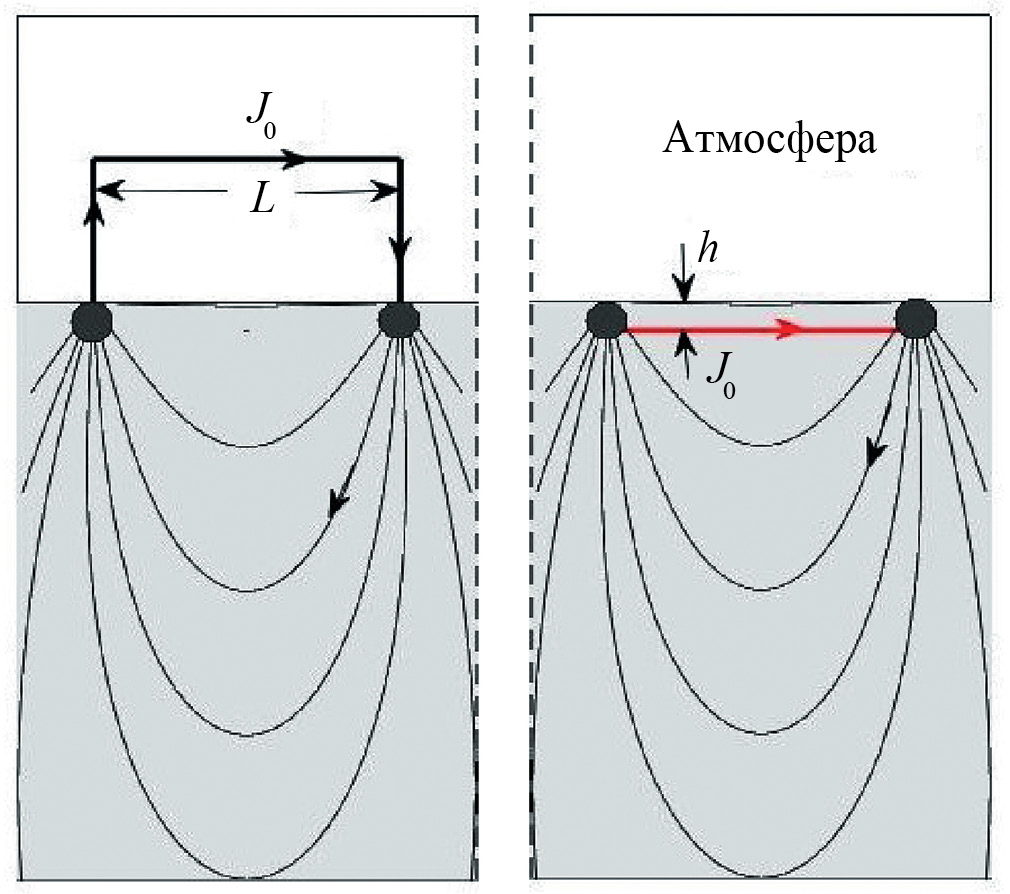 Сформулированная таким образом задача не имеет аналитического решения. Поэтому мы заменяем исходную модель источника более простой, электромагнитные поля которой близки к полям исходной модели. Один из известных способов состоит в замене горизонтального заземленного провода магнитной рамкой [14] c магнитным моментом , образуемой током провода и током замыкания на глубине скин-слоя в земле δg. Однако это приближение пригодно лишь для расстояний ρ >> max(L, δg). В нашей работе мы используем другую приближенную модель, в которой заземленный изолированный провод опускается под землю на небольшую глубину [11]. Изменение высоты провода на несколько метров никак не сказывается на поле в атмосфере и ионосфере, однако позволяет корректно учесть токи растекания в земной коре.