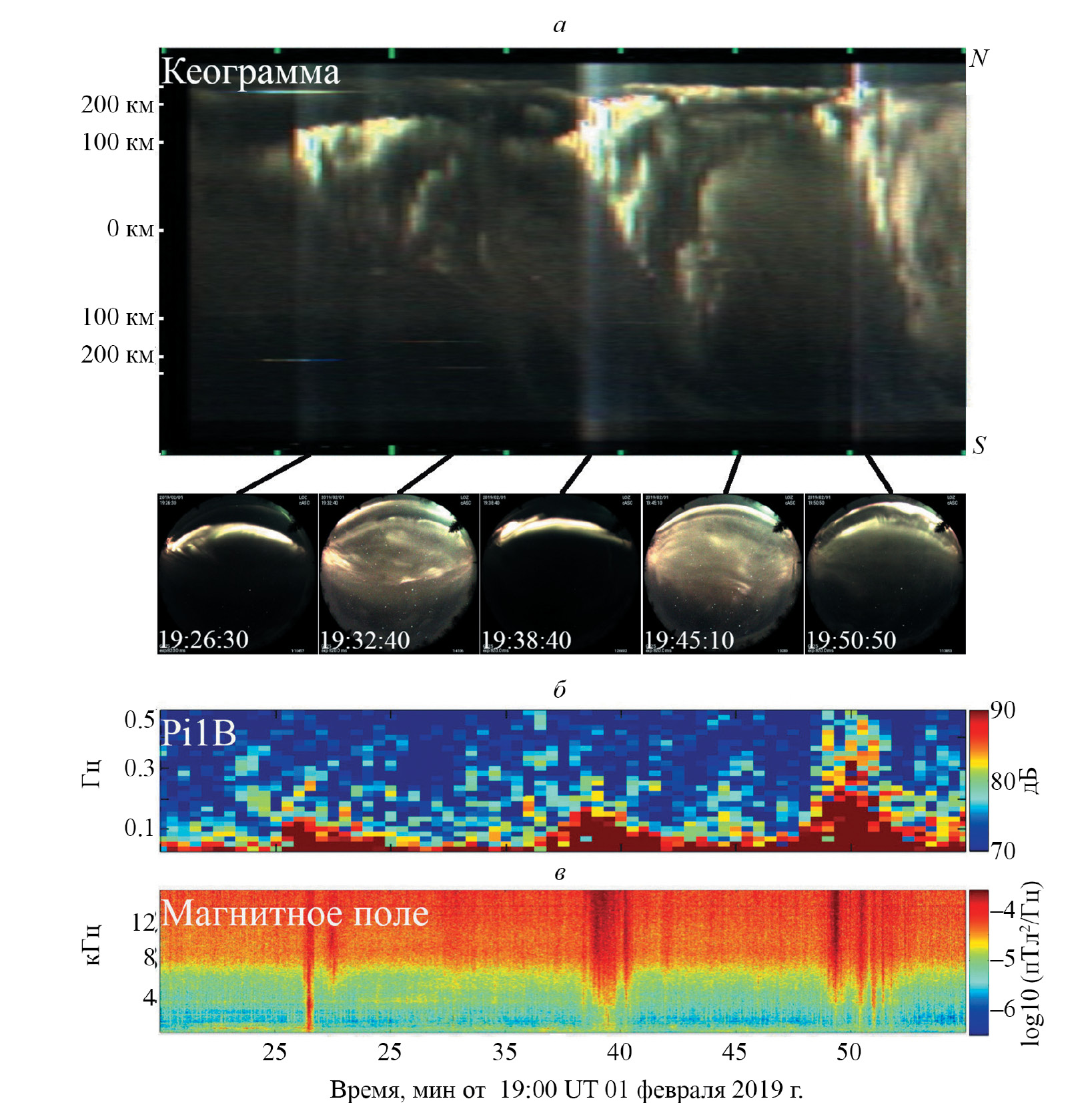 Другой пример одновременной регистрации всплесков аврорального хисса, геомагнитных пульсаций и полярных сияний представлен на рис. 2. Это событие 1 февраля 2019 г. в 19:20—19:55 UT. В рассматриваемый интервал регистрируются три серии коротких всплесков аврорального хисса (рис. 2в). Каждая из этих серий сопровождается возникновением геомагнитных пульсаций Pi1B (рис. 2б). Поскольку верхняя частота пульсаций не превышает 0.5 Гц, для наглядности спектрограмма X-компоненты геомагнитного поля рассчитана в диапазоне 0.03—0.5 Гц.