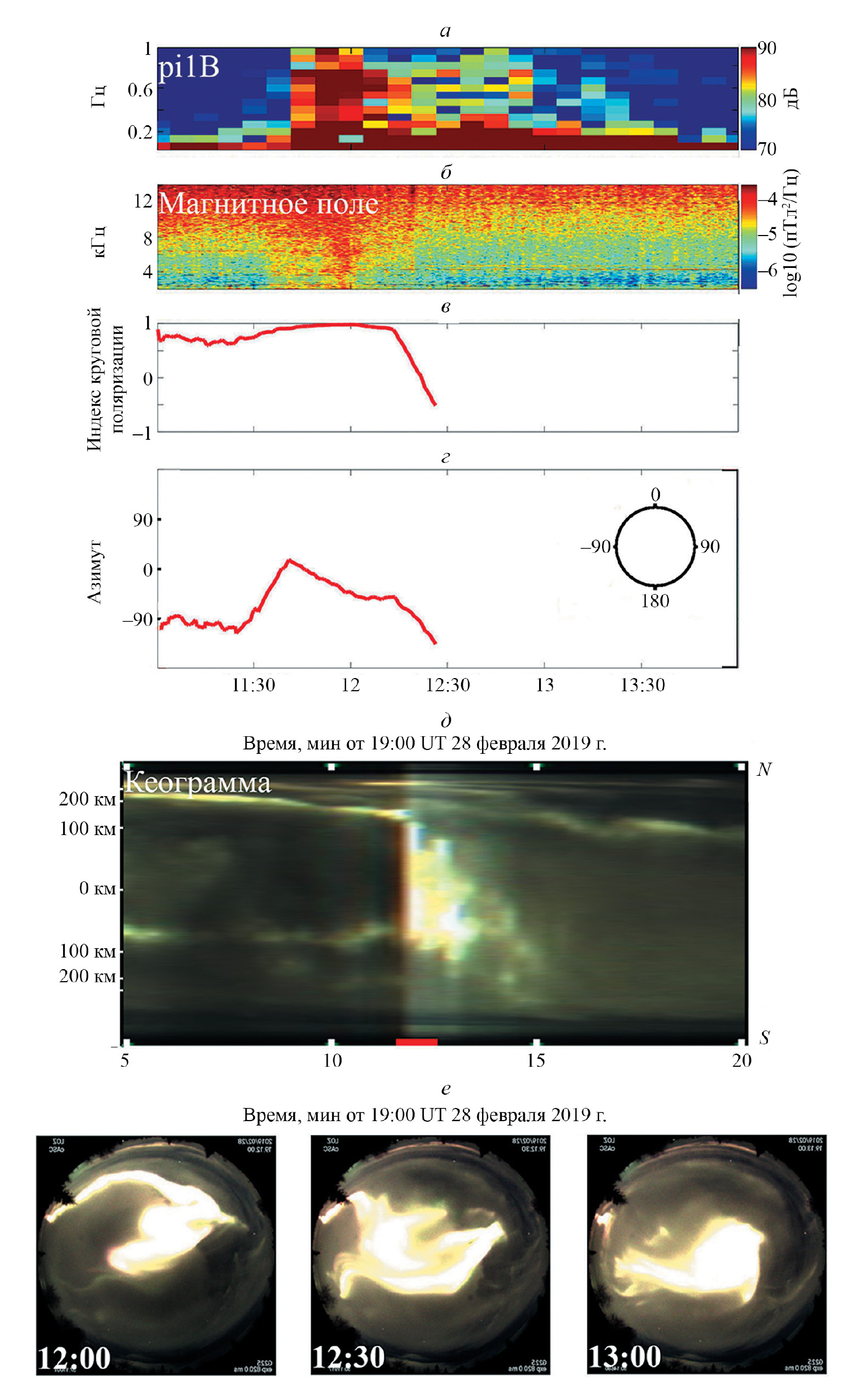 Рис. 3. Событие 28 февраля 2019 г. в 19:11—19:14 UT. Спектрограммы X-компоненты геомагнитного поля Pi1B-пульсаций в диапазоне 0.03—1 Гц (а) и горизонтальной компоненты магнитного поля ОНЧ в диапазоне 2—14 кГц (б); максимумы распределений азимутального угла вектора, обратного вектору Пойнтинга, (в) и индекса круговой поляризации (г); кеограмма полярных сияний, построенная по данным наблюдений в обсерватории “Ловозеро” для интервала 19:05—19:20 UT, красная линия означает время наблюдения аврорального хисса (д); снимки all-sky камеры по данным наблюдений в обсерватории “Ловозеро” (е)