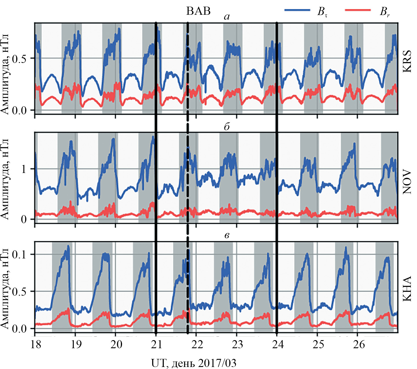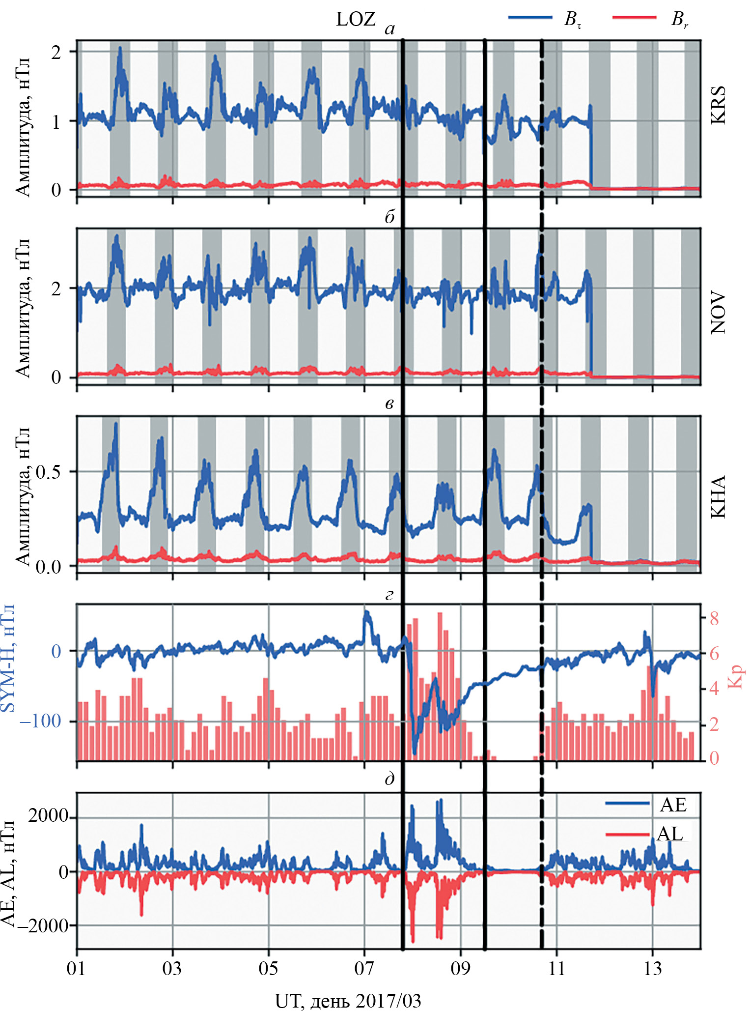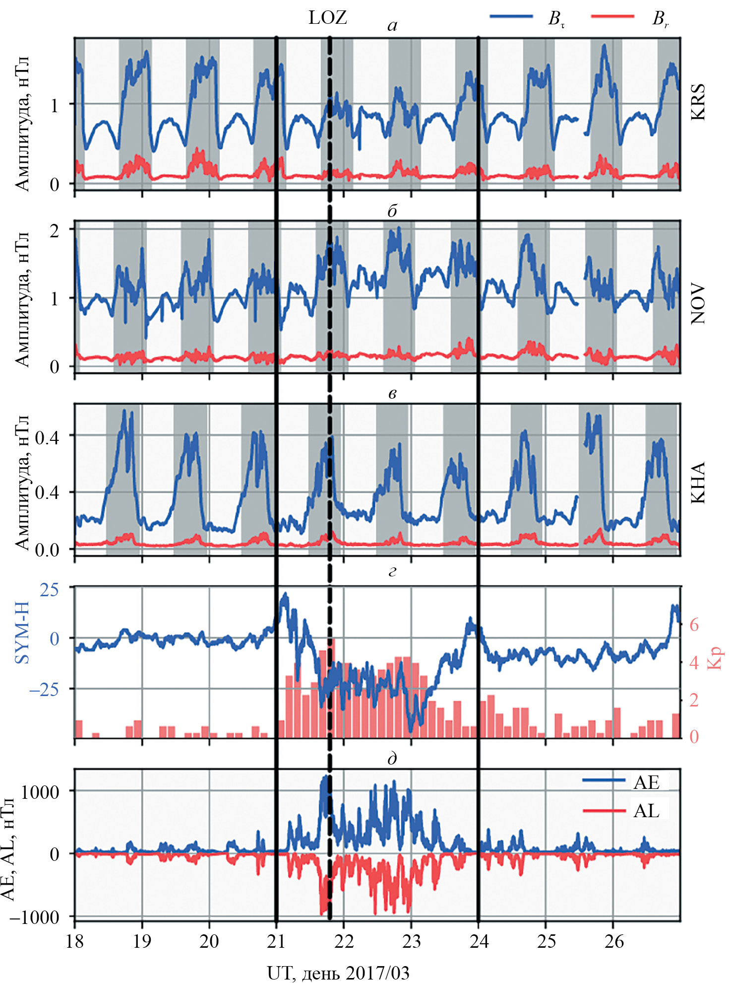 На рис. 1 приведены амплитуды радиальной и тангенциальной компонент магнитного поля передатчиков KRS, NOV и KHA, зарегистрированные в LOZ в марте 2017 г. Затемнением показано время ночи для середин радиотрасс. На панелях ниже приведены индексы геомагнитной активности: SYM-H и Kp (рис. 1г), AE и AL (рис. 1д).