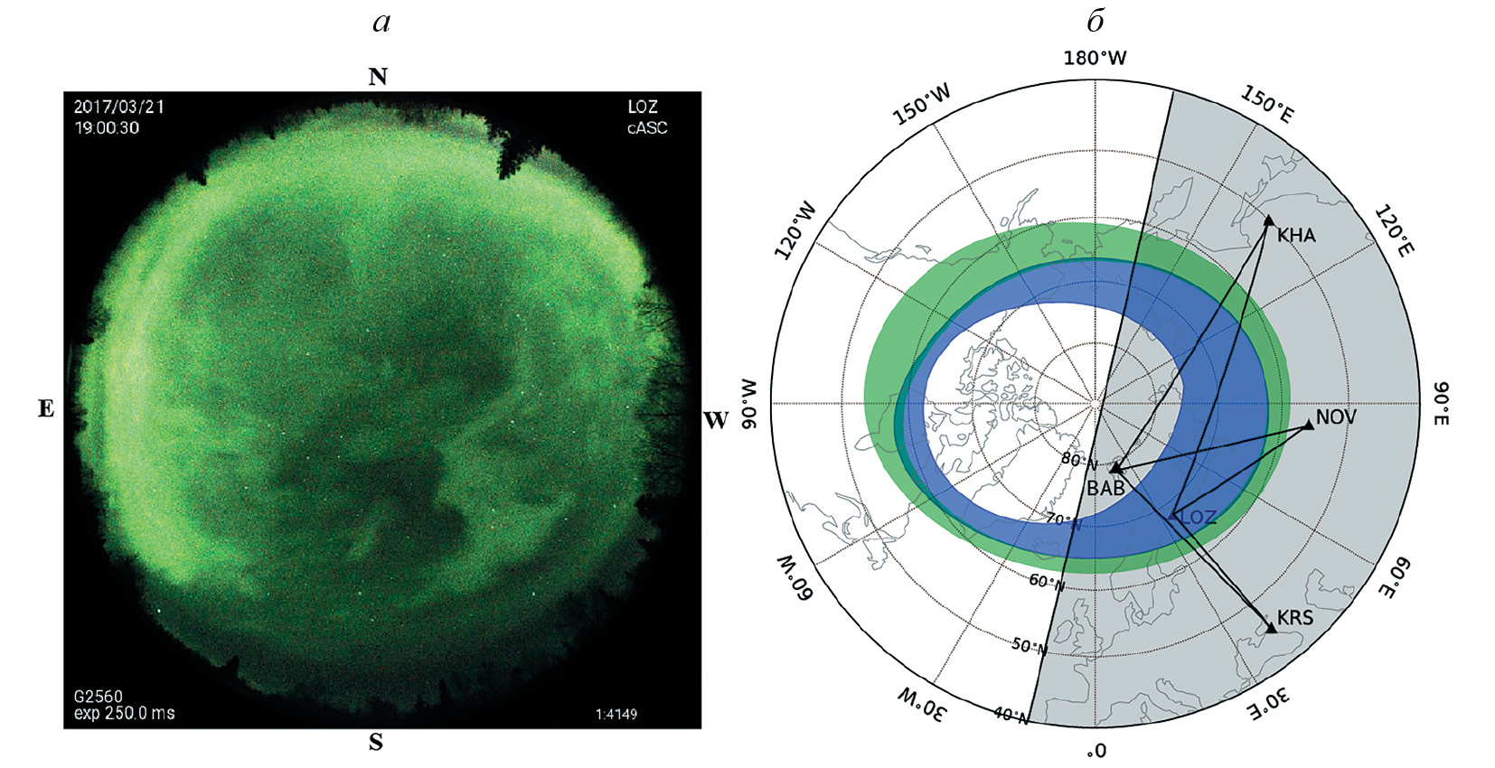 Рис. 5. Для 19:00 UT 21 марта 2017 г.: снимок камеры всего неба обсерватории “Ловозеро” (а) и положение овала полярных сияний относительно трасс распространения сигналов передатчиков, полученное по модели высыпаний (б)