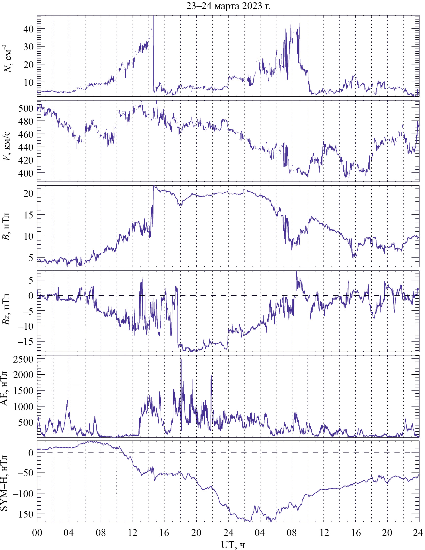 Рис. 1. Вариации скорости V, плотности N солнечного ветра, модуля ММП B, Bz-компоненты ММП, AE-индекса, SYM-H-индекса для 23—24 марта 2023 г.