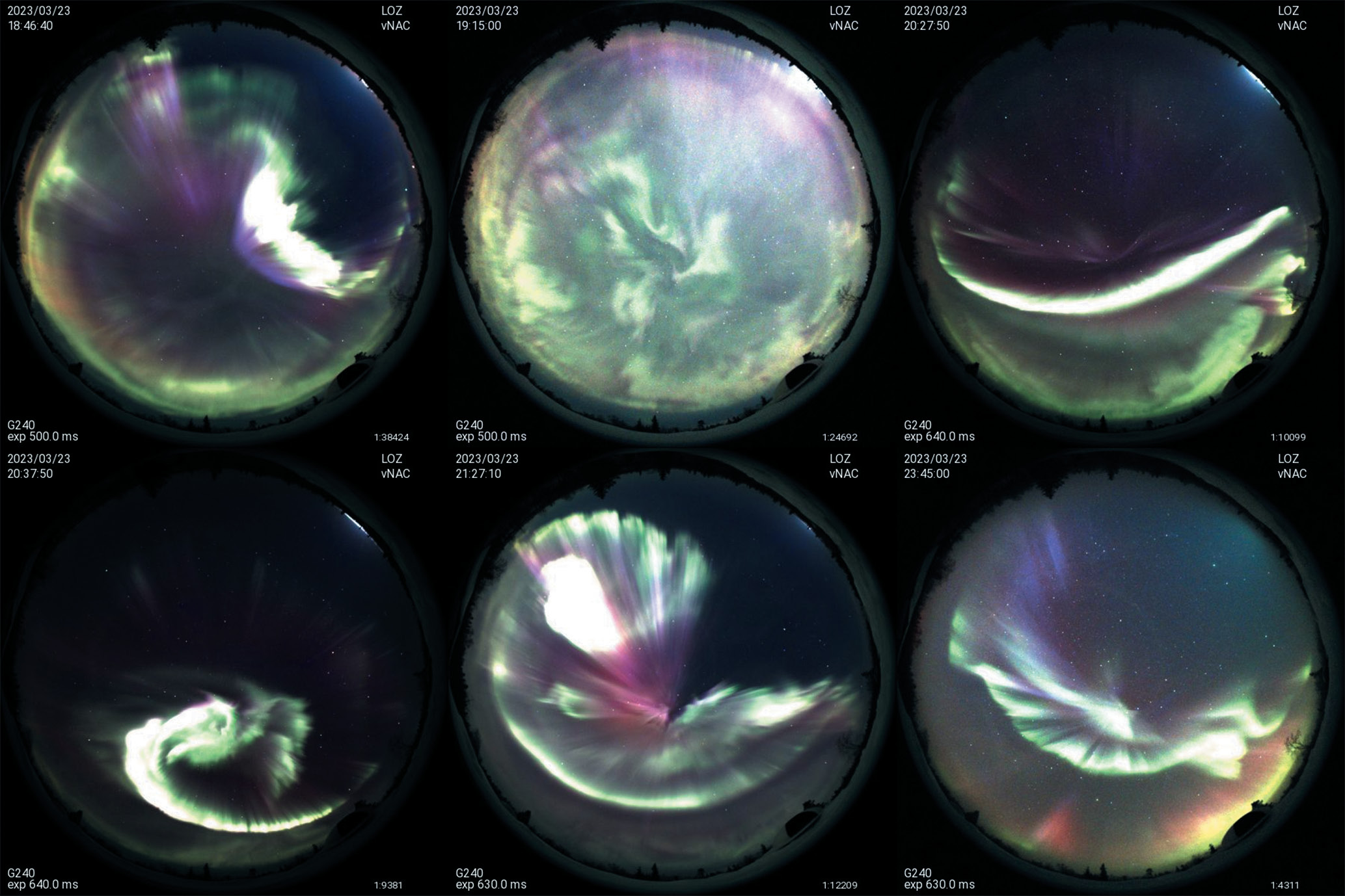 Рис. 5. Кадры камеры всего неба в обсерватории “Ловозеро” 23 марта 2023 г. для моментов времени 18.46, 19.15, 20.27 UT (верхняя панель), 20.37, 21.27, 23.45 UT (нижняя панель)
