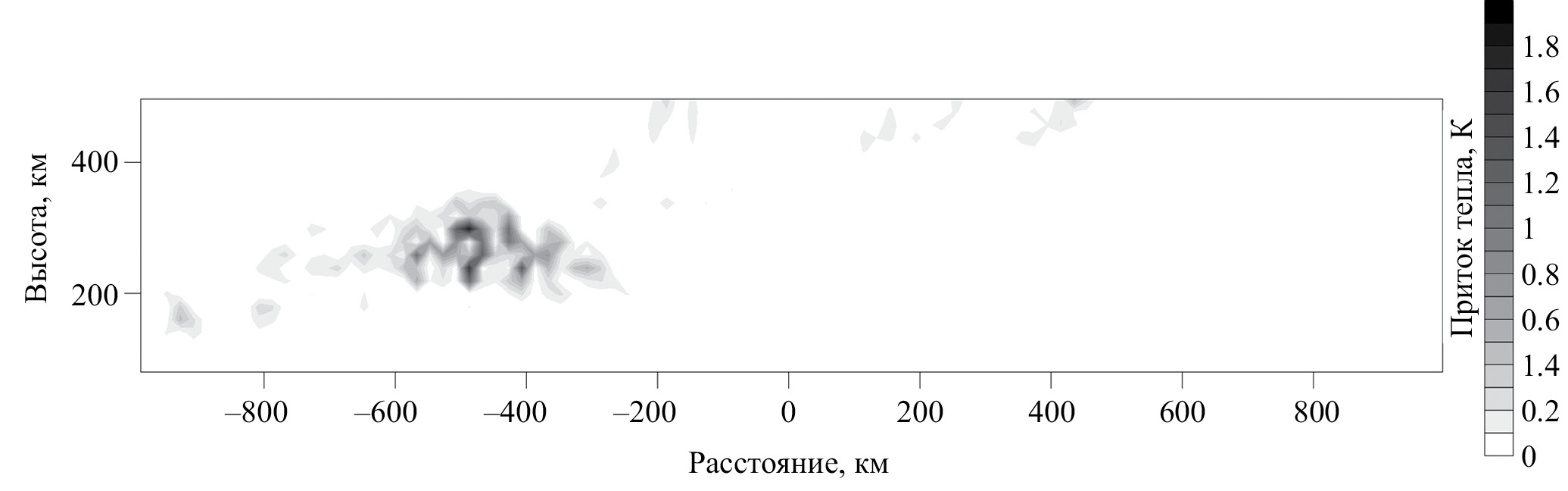 Для рассматриваемого метеорологического события были рассчитаны поля притока тепла (рис. 5), обусловленные распространением атмосферных волн из тропосферы в исследуемый период. Полученные результаты показывают, что волны, распространяющиеся от квазиточечного источника в разных направлениях, имеют разные спектральные характеристики, что приводит к ассиметричному распределению притока тепла. Полученные распределения притока тепла пригодны для интегрирования по пространству в соответствии с масштабами предполагаемой сетки крупномасштабной модели. Например, полученные результаты можно использовать в качестве дополнительного источника тепла в правой части уравнений модели ГСМ ТИП [28] и, соответственно, EAGLE [29, 30].