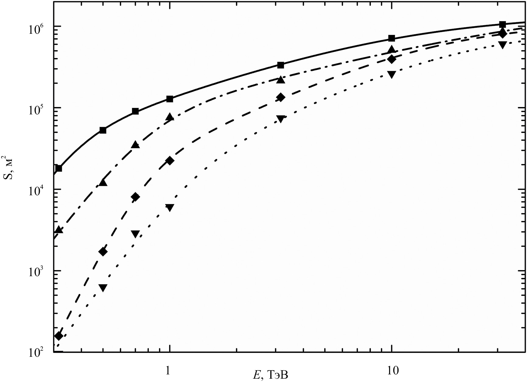 Рис. 2. Зависимости эффективных площадей от энергии первичной частицы, полученные методом Монте-Карло, показаны символами, соответствующие аппроксимации — кривыми. Квадраты и сплошная кривая соответствуют результатам для гамма-квантов при использовании фильтра SL 290-590. Ромбы и штриховая кривая соответствуют результатам для протонов КЛ при использовании фильтра SL 290-590. Треугольники, направленные вверх, и штрихпунктирная кривая соответствуют результатам для гамма-квантов при использовании фильтра SL 280-390. Треугольники, направленные вниз, и пунктирная кривая соответствуют результатам для протонов КЛ при использовании фильтра SL 280-390