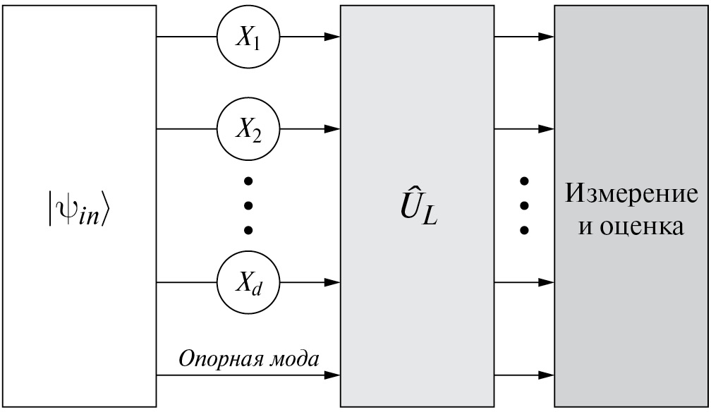 где параметры ε ≠ 0, удовлетворяют условию нормировки состояния |ψin>, которое является пробным для d неизвестных фазовых сдвигов φ ≡ χNk, где χ ≡ {χj} — вектор неизвестных измеряемых параметров, см. рис. 1. В результате (2) преобразуется в состояние
