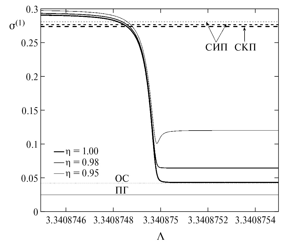 На рис. 3 изображены оценки предельной точности квантовой метрологии с состояниями ТМСДК при k = 1 и разных значениях в зависимости от Λ непосредственно вблизи точки фазового перехода Λкр = 3.30272. Наиболее жирные линии на рис. 3 соответствуют пределу η = 1, характеризующему максимальную точность квантовой метрологии, достигаемую в отсутствие потерь. В частности, жирная пунктирная линия характеризует СКП; тонкая сплошная линия — ПГ [34]. В отсутствие потерь точность σ(1) приближается к точности с использованием оптимального состояния. Как можно видеть из рис. 3, точность σ(1) превосходит СИП (21) при Λ > Λкр, т. е. когда ТМСДК приготавливается в состоянии, близком к NооN-, даже при наличии умеренных потерь.