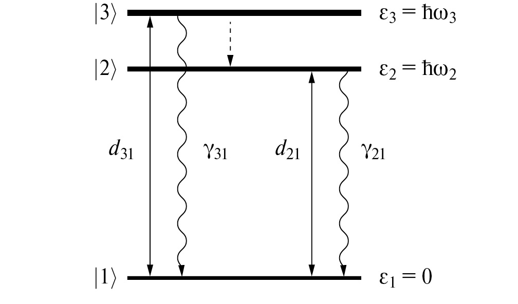 Оптические переходы разрешены только между верхними состояниями дублета |3> и |2> и нижним состоянием |1> (V-схема оптических переходов). Эти переходы (сплошные стрелки) характеризуются векторами дипольных моментов переходов и , которые параллельны друг другу, а значения их вещественны, так что d31 = µd21 ≡ µd. Верхние дублетные состояния |3> и |2> спонтанно затухают (волнистые стрелки) в основное состояние |1> со скоростями γ31 и γ21 соответственно, которые подчиняются соотношению γ21 = μ2γ31. Предполагается, что частота дублетного расщепления ω32 мала по сравнению с частотами оптического перехода ω31 = ω3 –ω1 и ω21 = ω2 –ω1. На монослой падает нормально поляризованная вдоль дипольных моментов переходов плоская волна с частотой ω0, квазирезонансная оптическим переходам в V-квантовых излучателях. Безызлучательная релаксация в дублете задана константой γ32 и на графике показана пунктирной стрелкой.