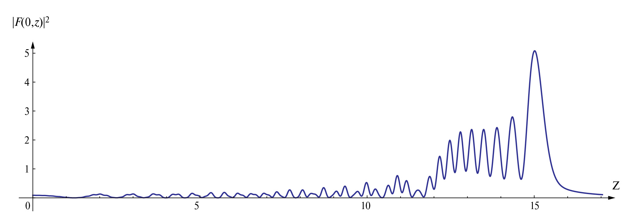 Для проверки формулы (14) были выполнены численные эксперименты. Поскольку вершина пика интенсивности в АФ-плоскости всегда находится на оптической оси (т. е. при x = y = 0), то достаточно было выбрать значение параметра смещения a и построить график зависимости интенсивности поля FRz[Ai3(ξ, η, a)](0,0) от переменной z, начиная с z = 0 и заканчивая некоторой величиной, превышающей значение zs. Один из полученных результатов показан на рис. 2. Как видно, для параметра смещения a = −28.9 значение zs, полученное численно, оказывается достаточно близким к величине, полученной из асимптотических соображений.
