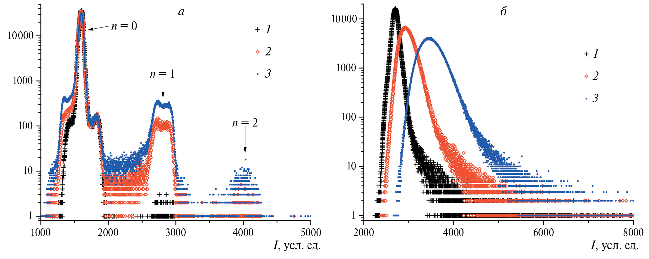 Рис. 2. Распределения среднего значения фототокалавинного фотодетектора (а) и фотоэлектронного умножителя (б), полученные при различных значениях мощности излучения лазера накачки: 0 (1); 1.2 (2); 3.46 мВт (3)