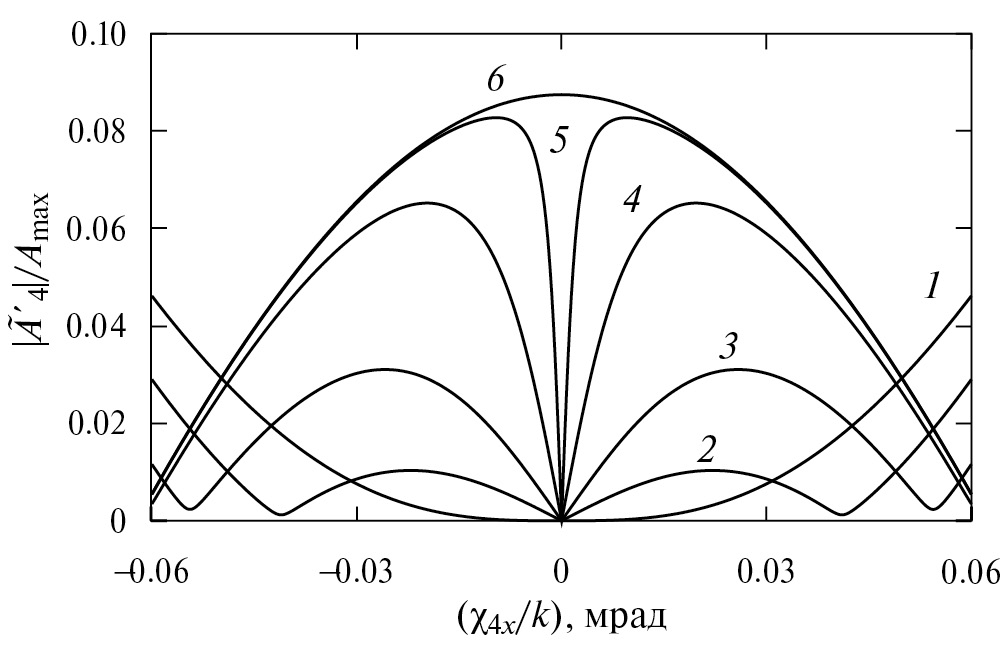 При отклонении направления распространения волн накачки от вектора даже на небольшой угол (рис. 4б) в случае полидисперсной наносуспензии минимальные значения модуля ПСОВ на пространственных частотах χ4x ≠ 0 отличны от минимальных значений в случае монодисперсной среды. Физически это связано с тем, что когерентно складываются ПСОВ , зависящие от среднего радиуса частиц. Увеличение a0 приводит к смещению минимальных значений модуля ПСОВ на частотах χ4x ≠ 0 в сторону больших по модулю частот (рис. 4, кривые 1 и 2) [20, 21], что вызывает отличие минимальных значений модулей ПСОВ и . Несовпадение же минимумов на кривых 3 и 4 рис. 4 связано с различием функций распределения частиц по размерам.