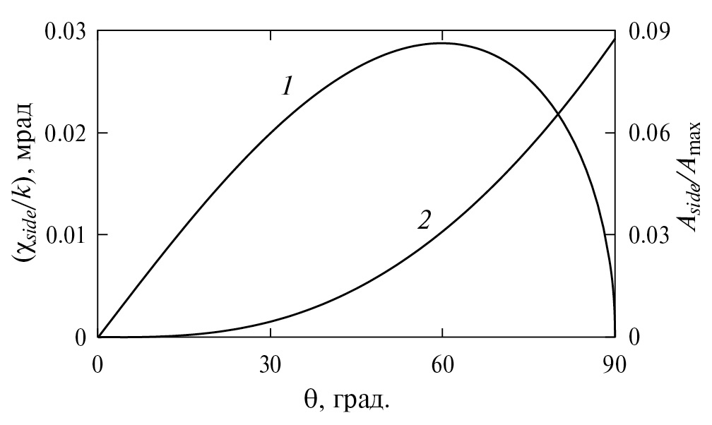 В случае монодисперсной наносуспензии с радиусом частиц равным 100 нм во всем диапазоне роста угла θ от 0 до 90° величина Aside монотонно увеличивается (рис. 3, кривая 2). Однако заметные значения, когда, например Aside составляет не менее 1% от постоянного значения Amax, достигаются при углах θ более 40°. Даже при θ = 90° величина Aside составляет чуть менее 9% от Amax. Это связано с тем, что для рассматриваемой среды радиус наночастиц соответствует введенному в [20] диапазону малых эффективных масс частиц, согласно которому Aside < Amax / 2. Равенство же Aside = Amax / 2 достигается, если радиус частиц равен 135.3 нм.