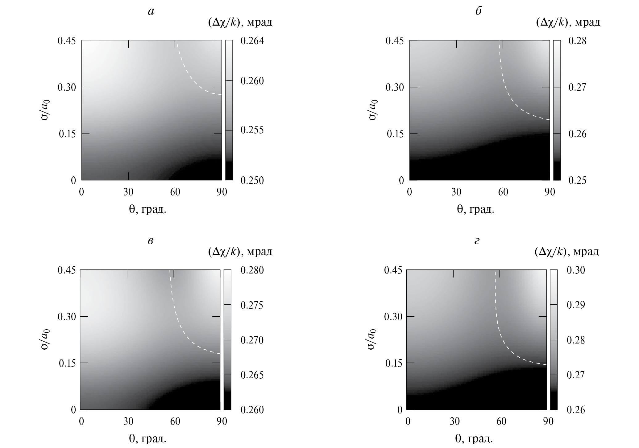 Приведем оценки уменьшения полуширины провала при повороте плоского слоя наносуспензии и схемы ЧПИ от значения θ = 90° до θopt. При среднеквадратичном отклонении σ, составляющем 40% от среднего радиуса частиц, согласно пунктирным линиям рис. 5а-г оптимальные значения углов равны соответственно 64.1°, 58.2°, 58.6° и 57.0°. Относительное уменьшение Δχ при таких углах по сравнению со значениями Δχ при θ = 90° составляет 0.48, 2.73, 2.38 и 5.61% соответственно.