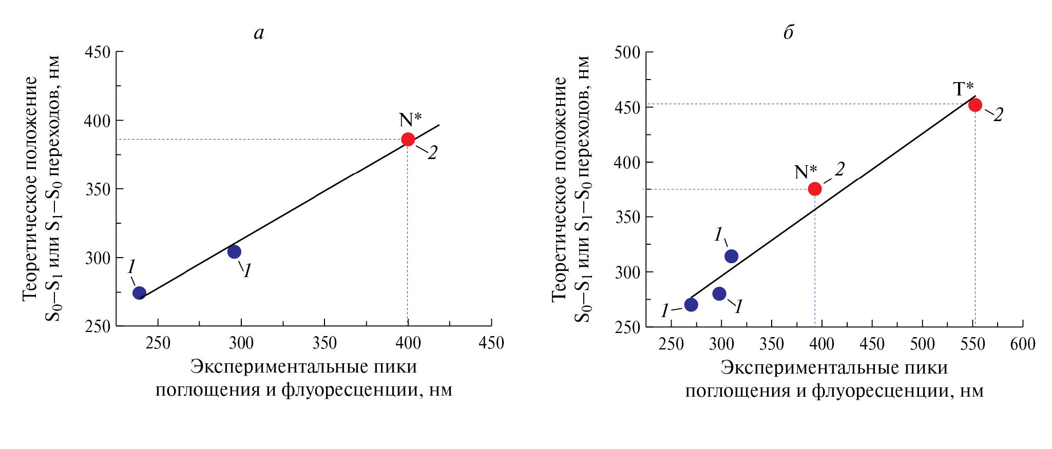 Рис. 3. Корреляция расчетных и экспериментальных длин волн в спектрах поглощения (1) и флуоресценции (2) различных таутомерных форм Люминофора 1 (а) и Люминофора 2 (б)